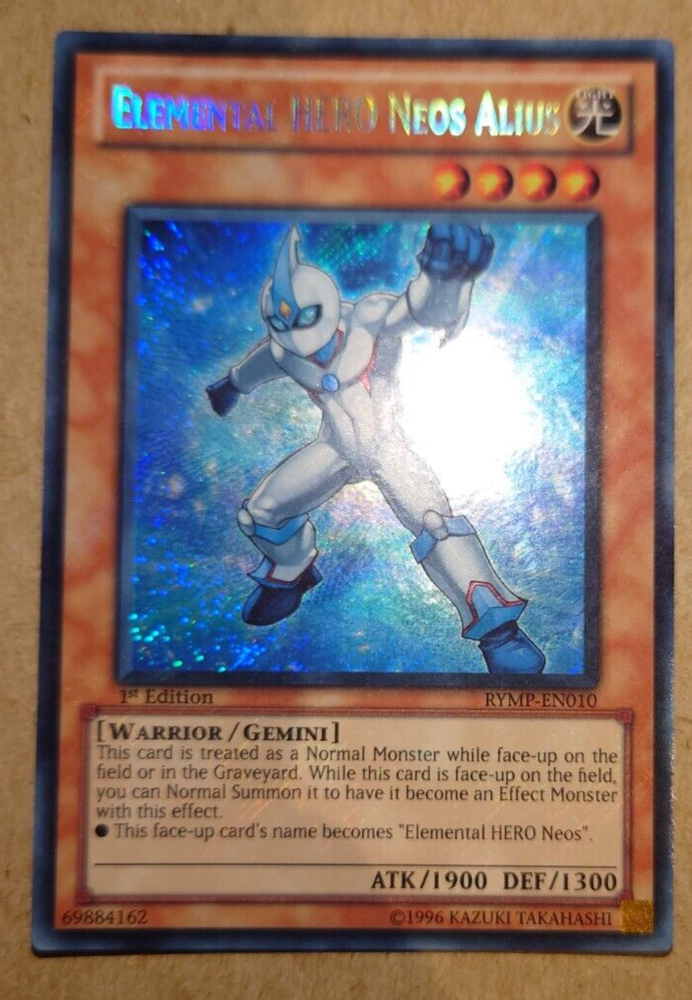 Elemental Hero Neos Alius RYMP-EN010 is a highly sought-after Secret Rare card from the Yu-Gi-Oh! TCG, specifically from the Ra Yellow Mega Pack set. Produced by Konami, this 1st Edition card is a valuable addition to any collector's deck. With its unique design and rarity, it is a must-have for fans of Yu-Gi-Oh! looking to enhance their gameplay experience with a touch of exclusivity.