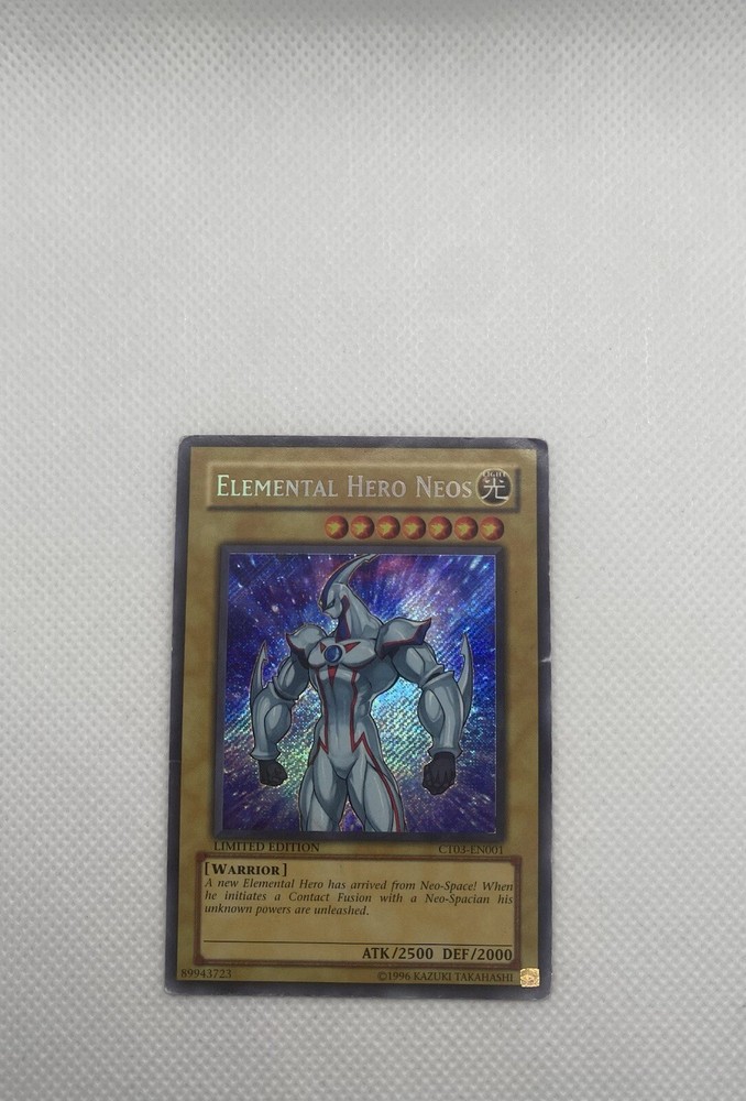 Up for sale is an Elemental Hero Neos from Collector’s Tins 2003 (CT03) , card #CT03-EN001 , featuring the stunning Secret Rare finish. This is a Limited Edition version of one of the most iconic Elemental Hero monsters from the GX era. Details: Card Name : Elemental Hero Neos Set : Collector’s Tins 2003 (CT03) Card Number : CT03-EN001 Rarity : Secret Rare Edition : Limited Edition Condition : MP (Moderately Played) – Visible surface scratches and minor wear, but still a great card for collecting or deck use. Shipping Info: All cards are shipped securely in a bubble mailer to ensure safe and protected delivery. (Tracking included) Please Note: Refunds are not accepted , so please review all photos and the description carefully before purchasing. Feel free to reach out with any questions. A must-have card for any Elemental Hero or GX series fan!