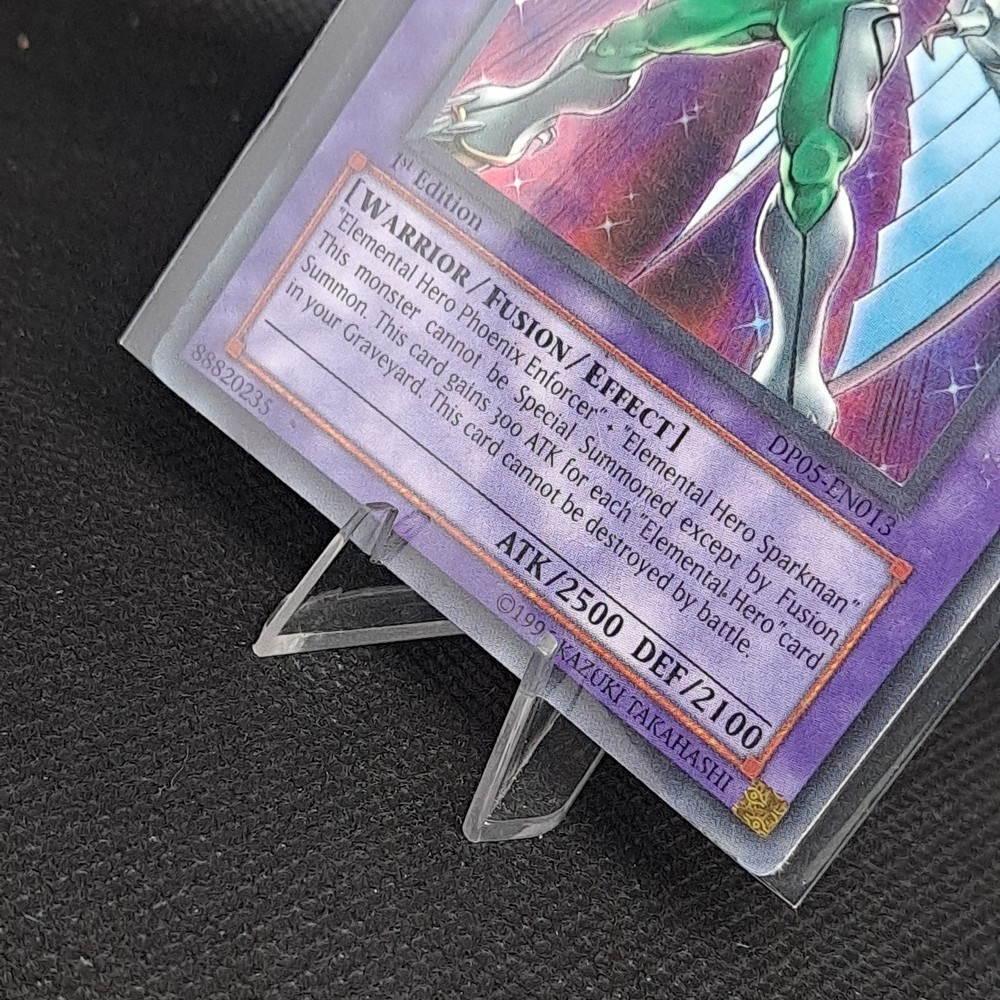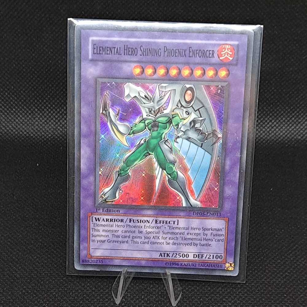 The Elemental Hero Shining Phoenix Enforcer (EOJ-EN033) 1st Edition FOIL card is a sought-after collectible in the Yu-Gi-Oh! TCG community. This Fusion type card features a shiny foil finish, making it a rare and valuable addition to any card collection. With its unique design and special edition status, this card is sure to be a prized possession for any Yu-Gi-Oh! fan.