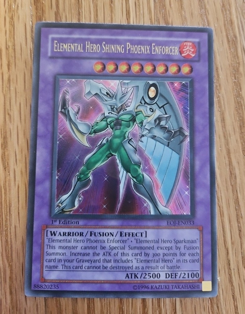 This Yu-Gi-Oh! TCG Fusion card is the Elemental Hero Shining Phoenix Enforcer, with the card number EOJ-EN033. It is in near mint or better condition, and is ungraded. This collectible card is perfect for fans of the game and collectors alike.