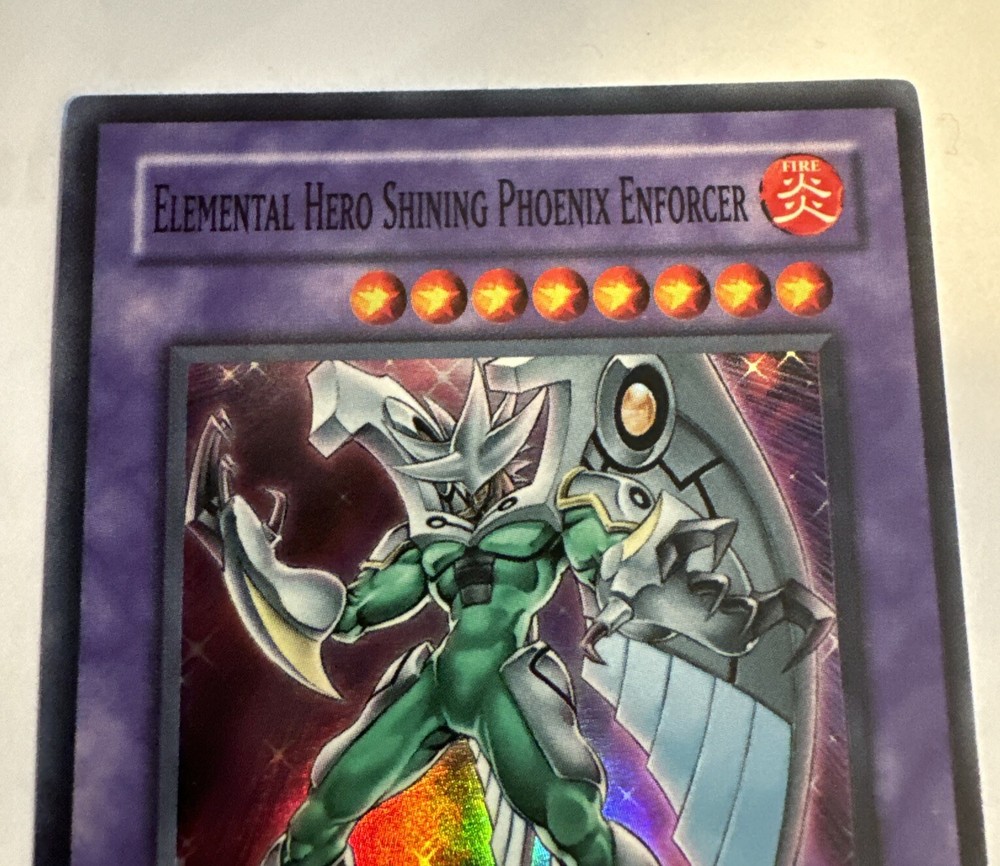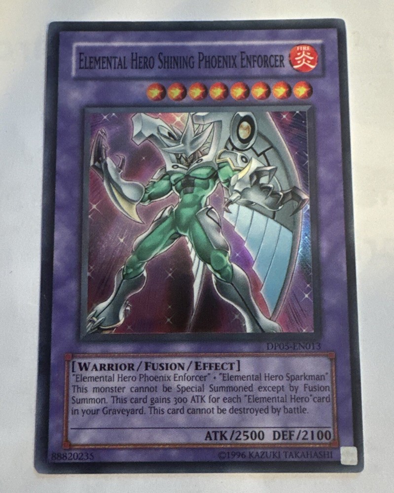 Elemental Hero Shining Phoenix Enforcer Super Rare Yugioh Card DP05-EN013. Near mint ***I will consider REASONABLE offers. If you offer 50% off or more I will not consider that a reasonable offer, and will be less likely to consider a lower price. Please do not ask me for a best price and counter with something way lower. I do combine shipping but do not ask for a shipping discount on a single item. We calculate shipping based on weight, size, and location.