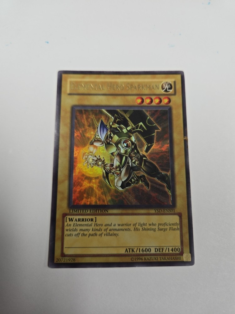 Step up your Yu-Gi-Oh! TCG collection with the Elemental HERO Sparkman from the Starter Deck 2006-Limited Edition. As a ultra rare, light-type warrior card numbered YSD-ENS01, Sparkman is a must-have for enthusiasts and competitive players alike. With an attack power of 1600 and a defense of 1400, this card is a formidable addition to any deck. Crafted by Konami, the card features the compelling artwork and design that the series is known for. Sparkman, being a level 4 card, offers a balance of strength and strategy, perfect for those looking to enhance their game or preserve a piece of Yu-Gi-Oh! history. The card is in English and remains ungraded, preserving its authenticity and allowing you to appreciate its value as is.