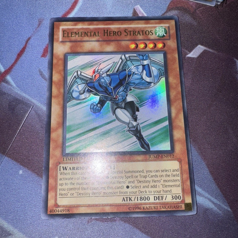 Unleash the power of the wind with the Elemental Hero Stratos card, a must-have for any Yu-Gi-Oh! TCG enthusiast. As a part of the Shonen Jump Magazine Promos, this ultra-rare warrior-type card boasts an attack power of 1800 and a defense toughness of 300, making it a formidable addition to your deck. Its unique effect can turn the tides of battle, giving you an edge against your opponents. Limited edition and highly sought-after, the Elemental Hero Stratos, card number JUMP-EN012, is produced by Konami and comes in English language. With its blend of rarity and strategic gameplay potential, it's a treasure for both serious collectors and seasoned duelists alike. Enhance your game experience with this iconic piece from the Yu-Gi-Oh! TCG lineup.