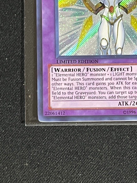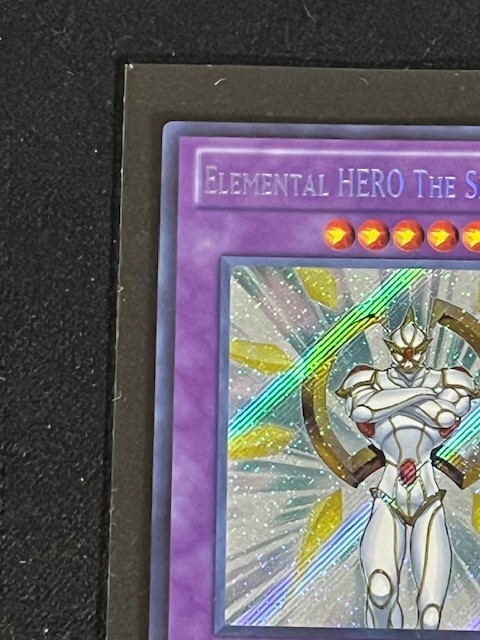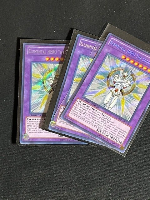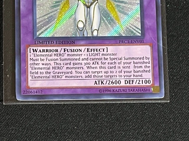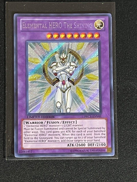 Elemental Hero The Shining PRC1-ENV01 Limited Edition Yu-Gi-Oh card. This card is in mint condition and will be shipped for free. This card will be shipped in soft plastic protector, with a card board insert, and in a protective card envelope.