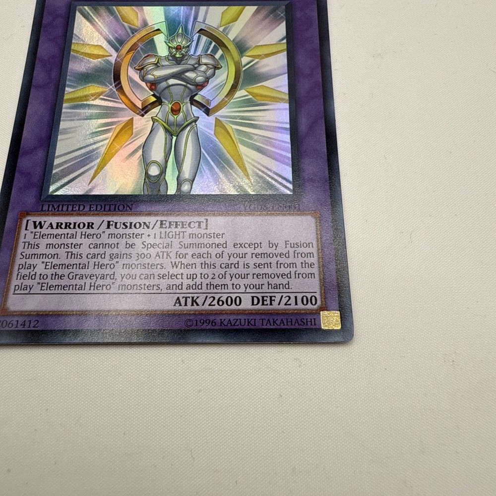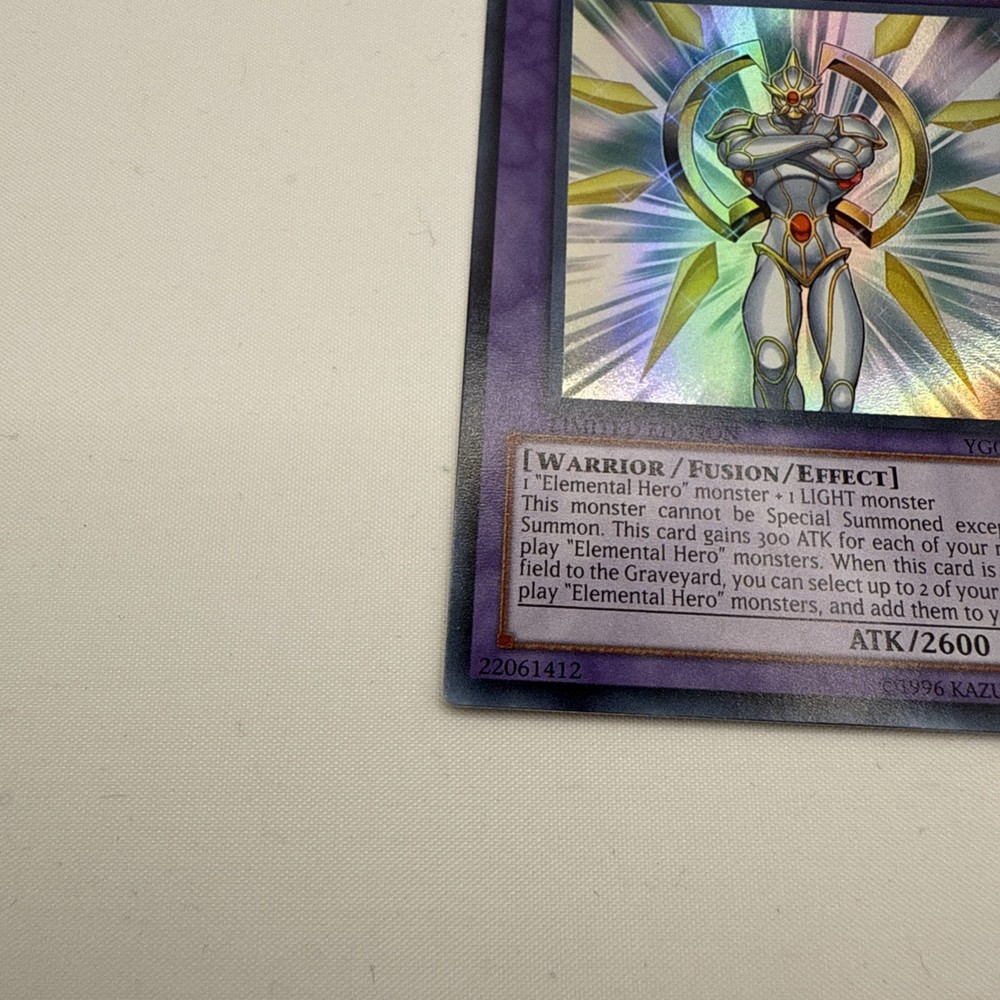 | Card Text | 1 "Elemental Hero" monster + 1 LIGHT monsterThis card cannot be Special Summoned except by Fusion Summon. This card gains 300 ATK for each of your removed from play "Elemental Hero" monsters. When this card is sent from the field to the Graveyard, you can select up to 2 of your removed from play "Elemental Hero" monsters, and add them to your hand. |
