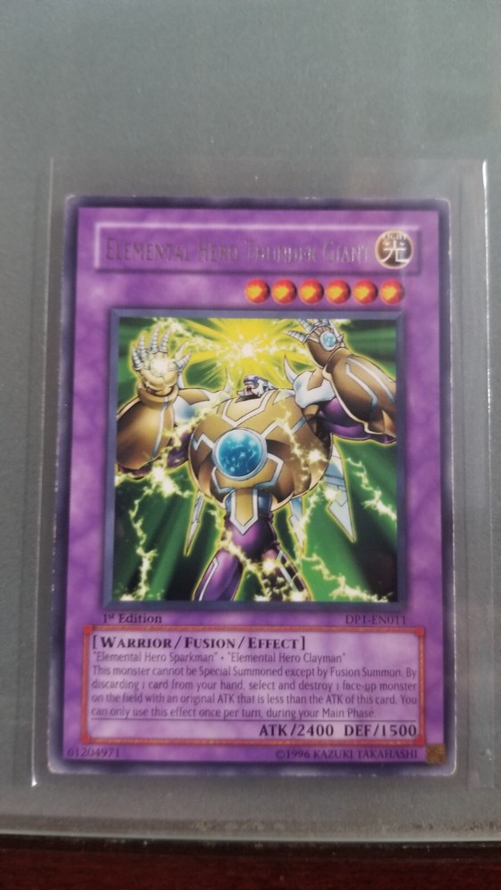The Elemental Hero Thunder Giant card is a powerful Warrior-type creature in the Yu-Gi-Oh! TCG, featuring a high defense/toughness of 1500 and an attack/power of 2400. Manufactured by Konami, this English-language card is part of the Duelist Pack 1: Jaden Yuki set. With the card number DP1-EN011, this collectible card is a valuable addition to any Yu-Gi-Oh! card collection.