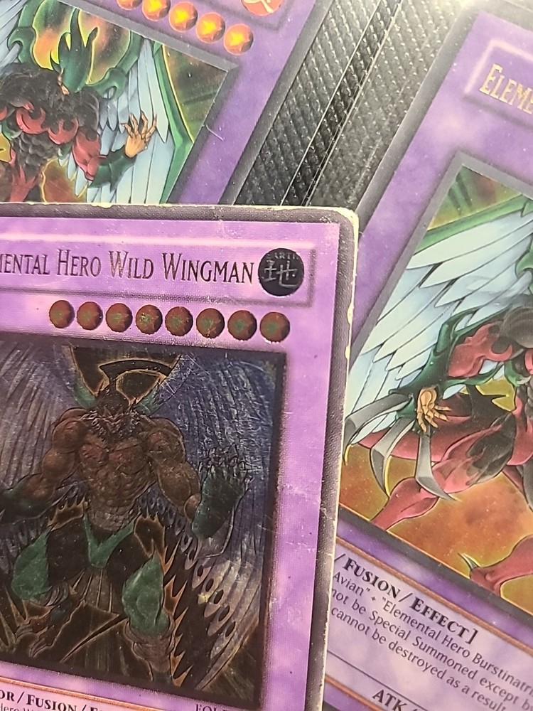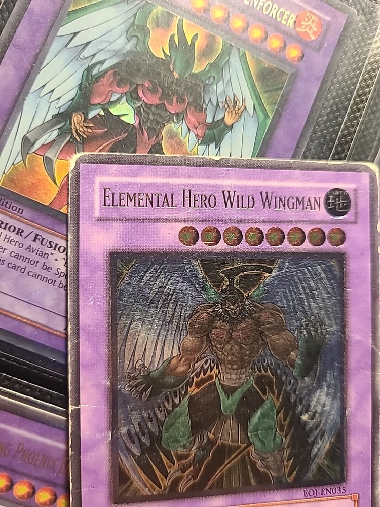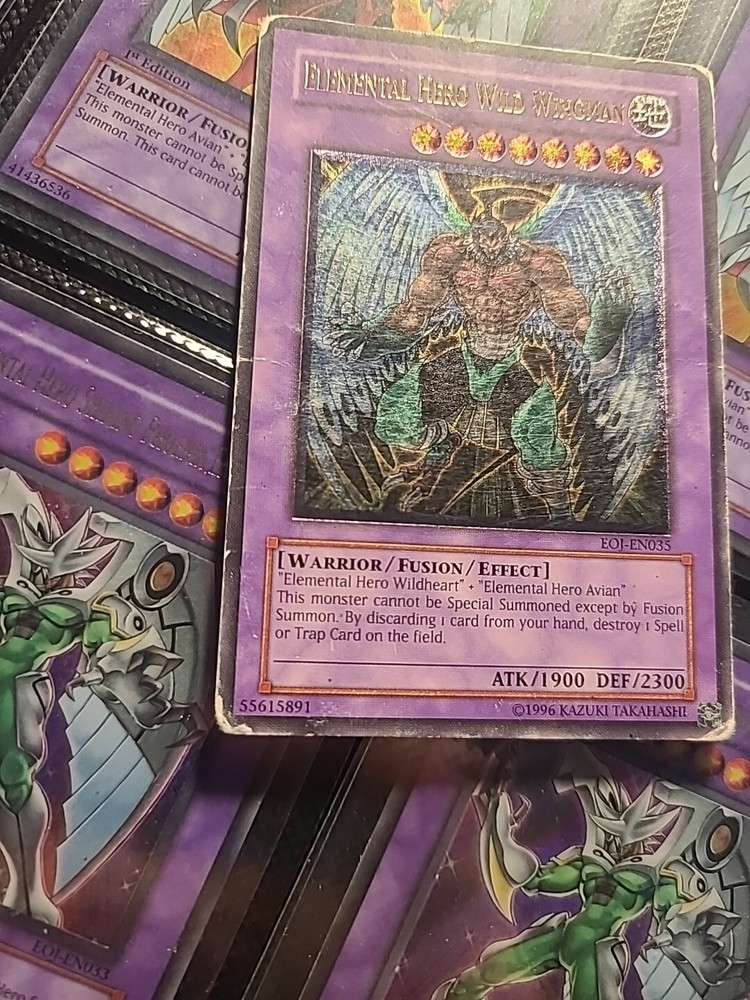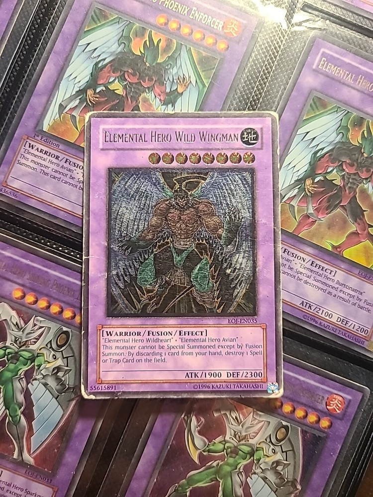 For collectors of Yu-Gi-Oh! cards, this Ultimate Rare 1st Edition Elemental Hero Wild Wingman from the Enemy of Justice set is a must-have. This card features a unique design and is highly coveted for its rarity. It has been well-loved and played, but remains a valuable addition to any collection. The card has some signs of wear and tear due to its age and previous use, however, it is still in playable condition. The features of the card include its Ultimate Rare status and 1st Edition print, making it a valuable piece for any collector. Add this Elemental Hero Wild Wingman to your Yu-Gi-Oh! collection today.