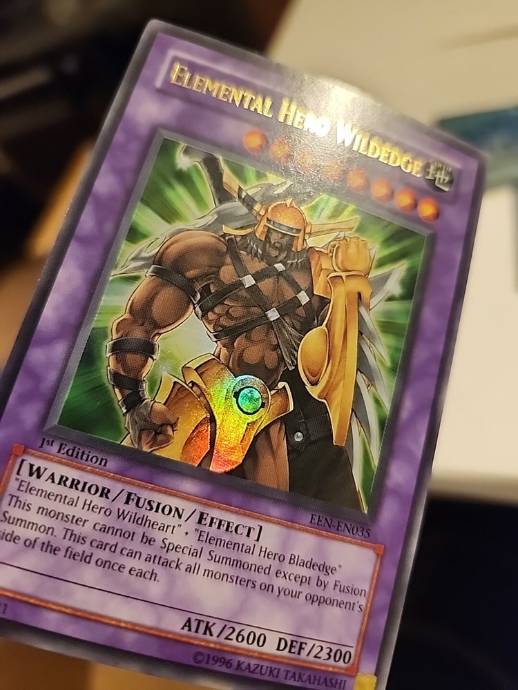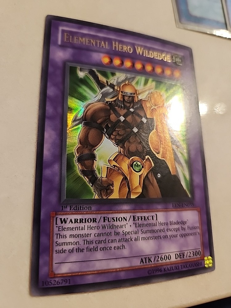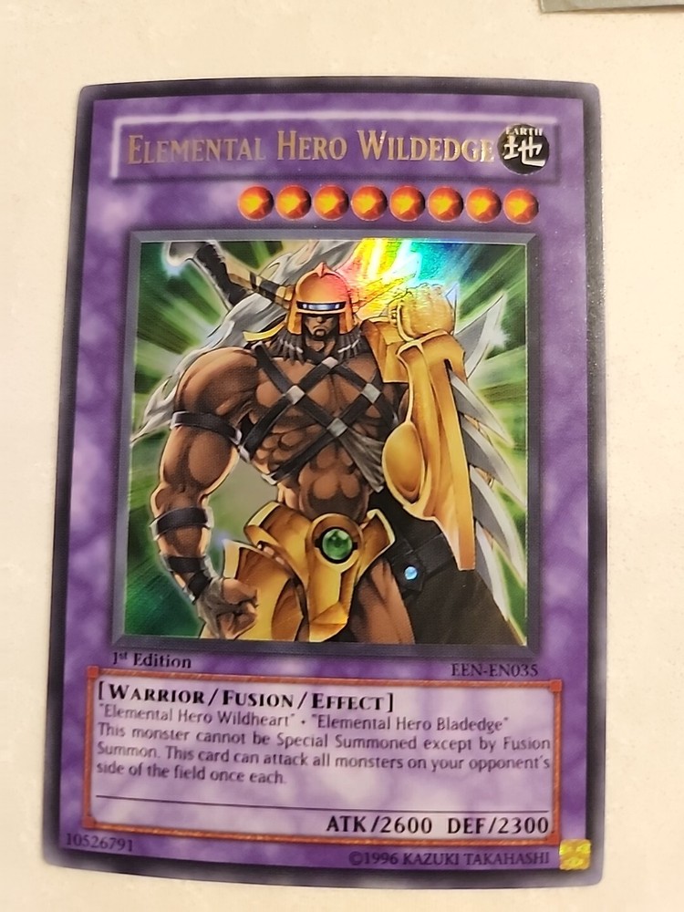This is an ultra-rare 1st edition Yu-Gi-Oh! TCG Elemental Hero Wildedge card with near mint condition. It's the perfect addition to any collection....