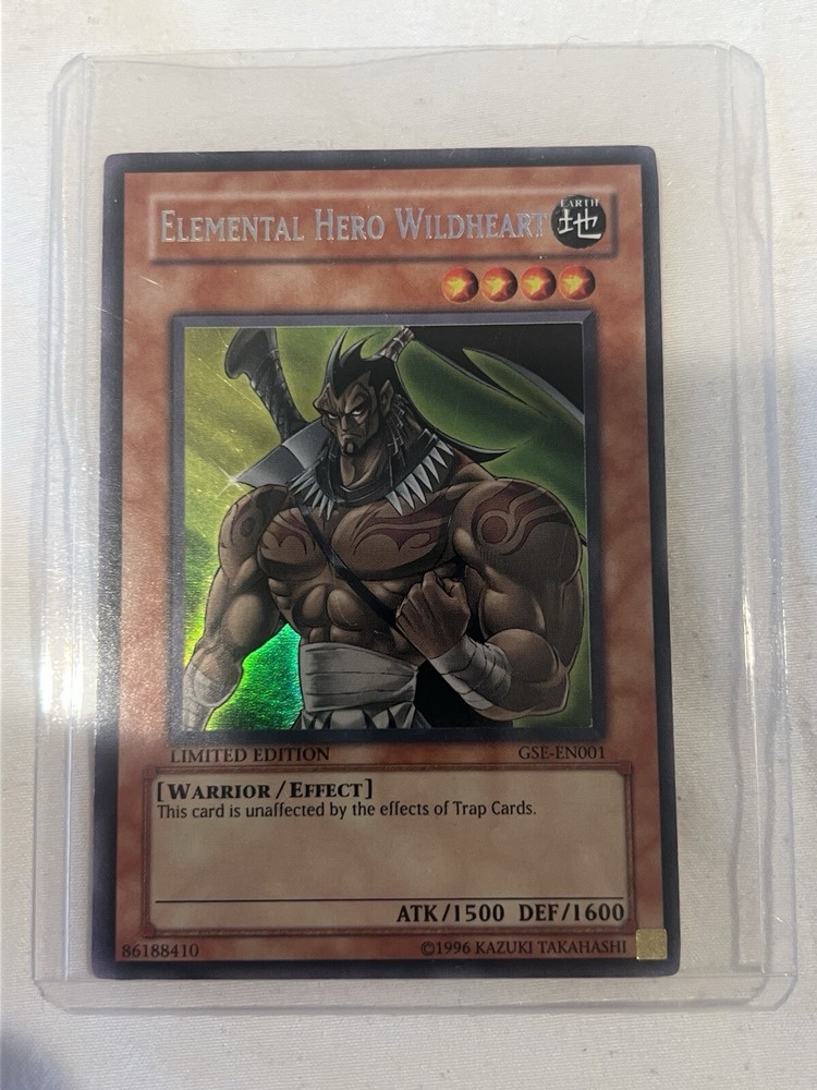 Ships in top loader with cardboard reinforcement. Dive into the strategic depths of the Yu-Gi-Oh! TCG with the Elemental HERO Wildheart card, a must-have for collectors and duelists alike. This Secret Rare card, denoted by the distinctive text "Limited Edition" and bearing the card number GSE-EN001, is an exceptional piece from Konami's esteemed series. Showcasing an impressive Holo finish, the card shines in the light, ready to make a striking impact in your deck. The Warrior-type Effect monster comes in English language and standard card size, fitting seamlessly into your collection. With its Earth attribute, it brings a natural power to the table, ideal for those looking to bolster their gameplay with elemental synergy. Whether for competitive play or for the sheer joy of collecting, the Elemental HERO Wildheart is an ungraded treasure waiting to be added to your Yu-Gi-Oh! arsenal.