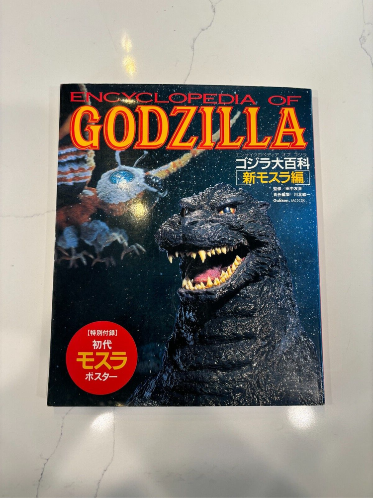 Japanese language (with some English) book The Encyclopedia of Godzilla, published by Toho in 1992 to coincide with the release of "Godzilla vs. Mothra: The Battle for Earth." Book is in good condition with some minor shelf-wear.