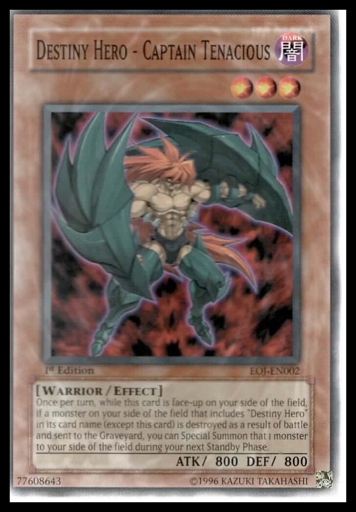 This is a nice example of a Enemy of Justice #EOJ-EN002 Destiny Hero Other important information about this card: In 2006 Destiny Hero played for the . Please check out our other listings for more great cards.