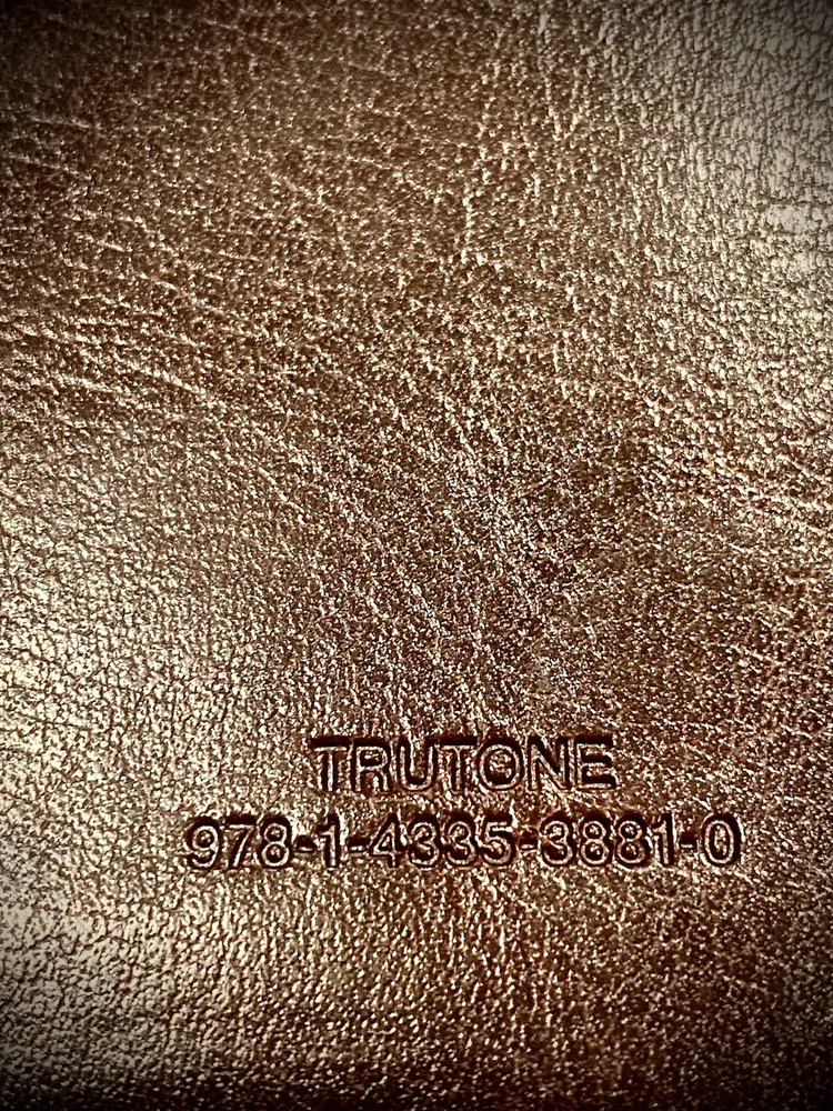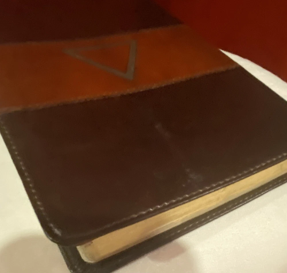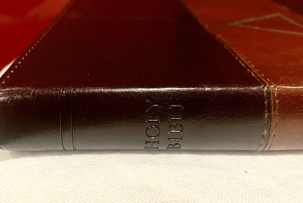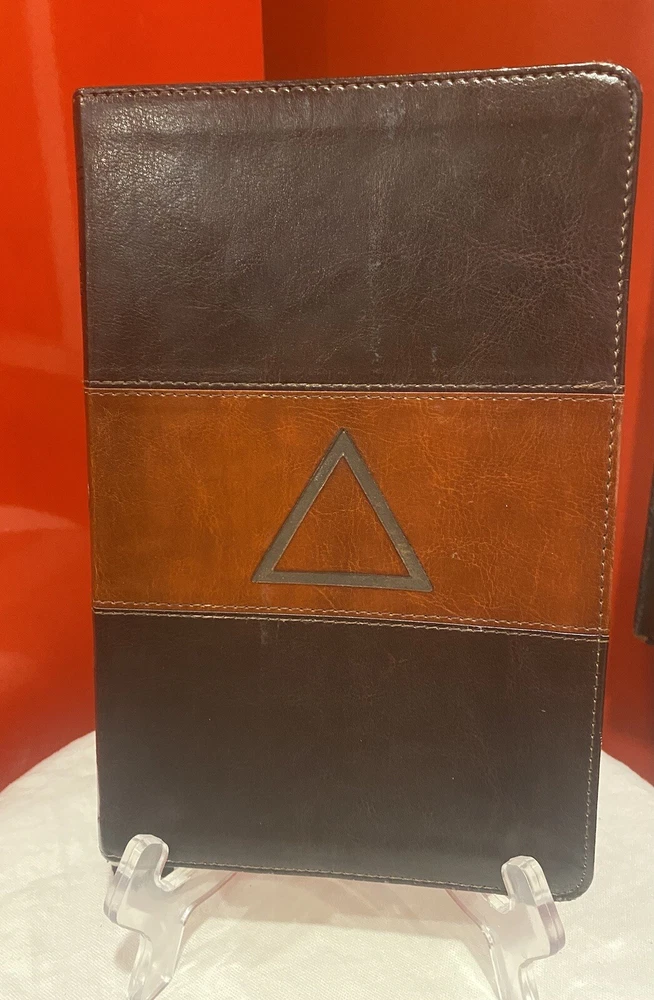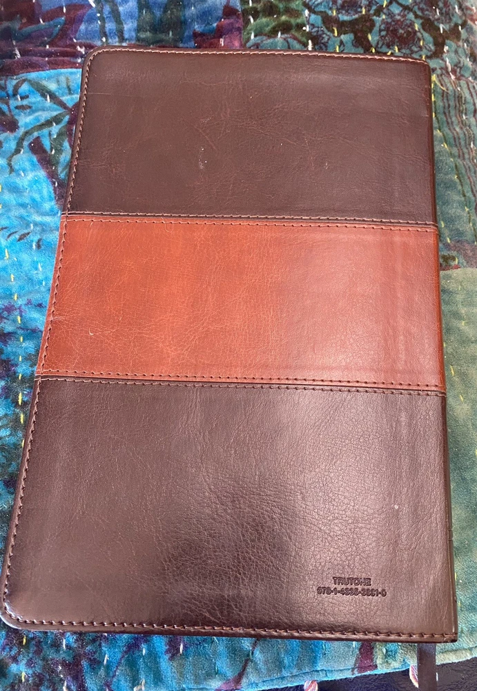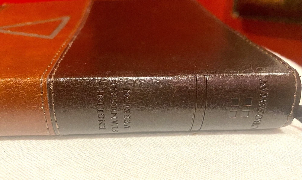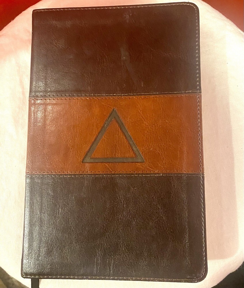 Solid, well-kept Crossway ESV Bible with rich leather-like Tru-tone cover is in excellent used condition with no tears, rips, holes, stains, missing pages or odors. Extensive personal dedication on inside front cover plus entries on dedication page and single entry in Records section appear to to be the only extraneous marks. Features include color-coordinated brown ribbon, Glossary and Maps section. Distinctive triangle symbol on front. Clean, cared-for Bible ships Media Mail from Los Angeles. Crossway English Standard Version ESV Study Bible TruTone w/Concordance, Maps.