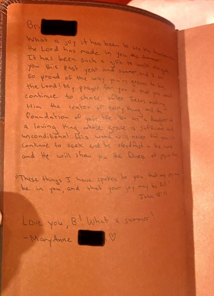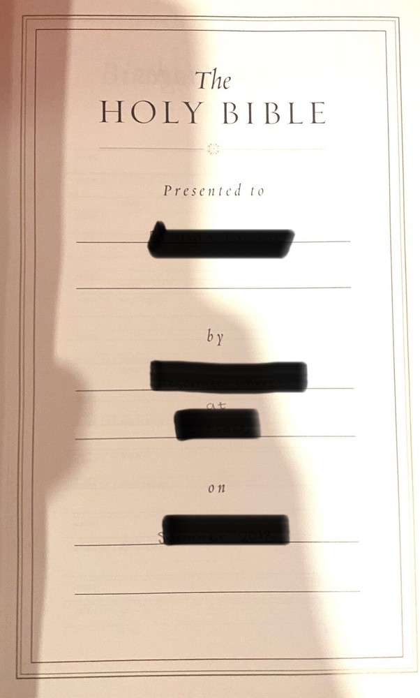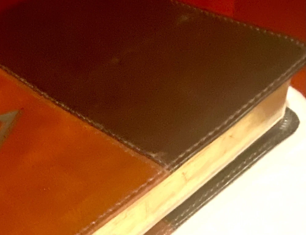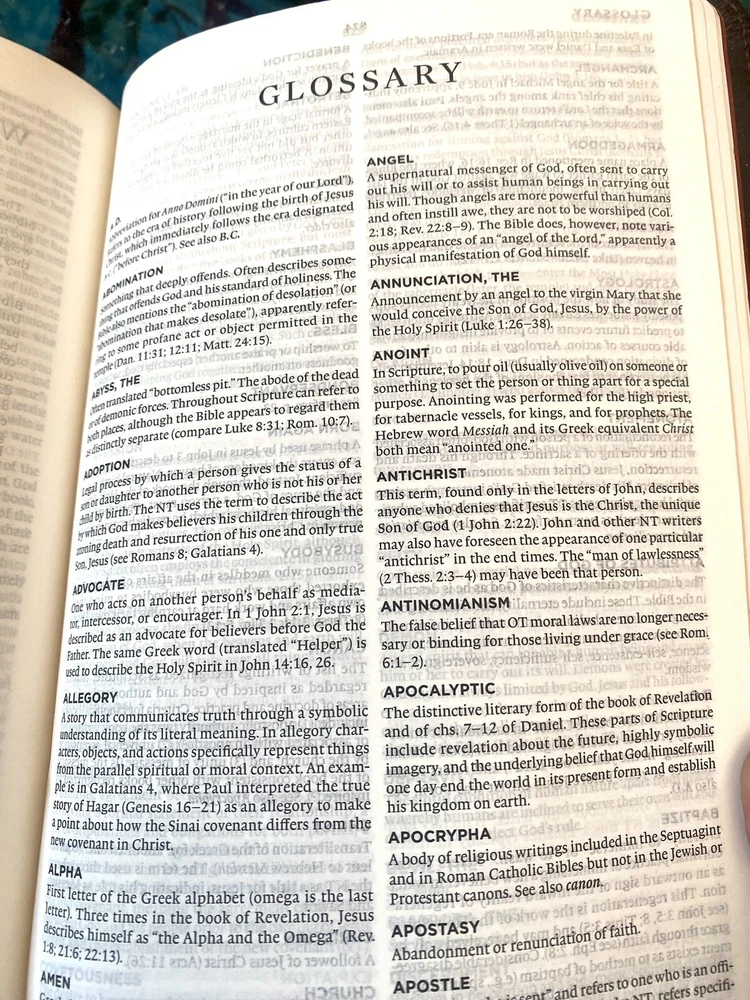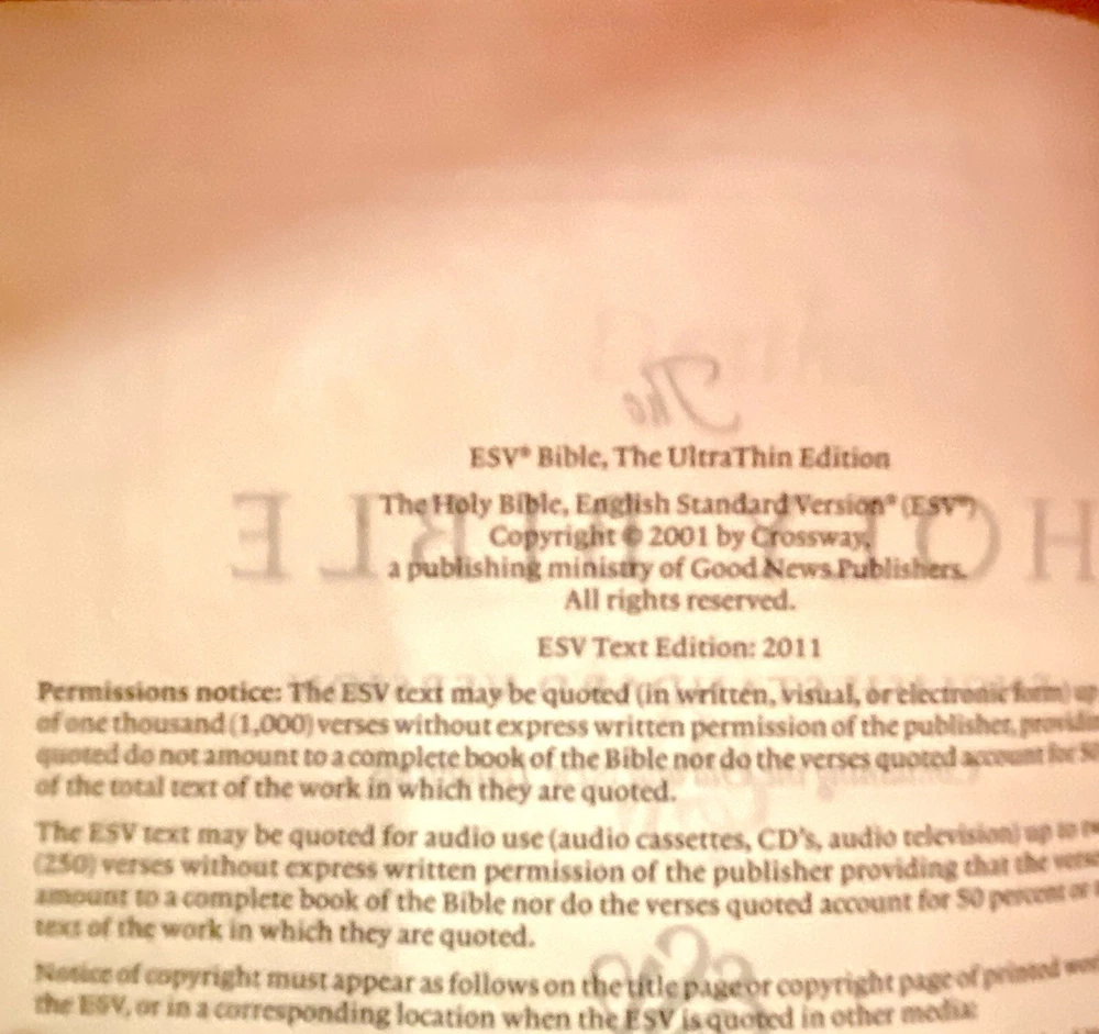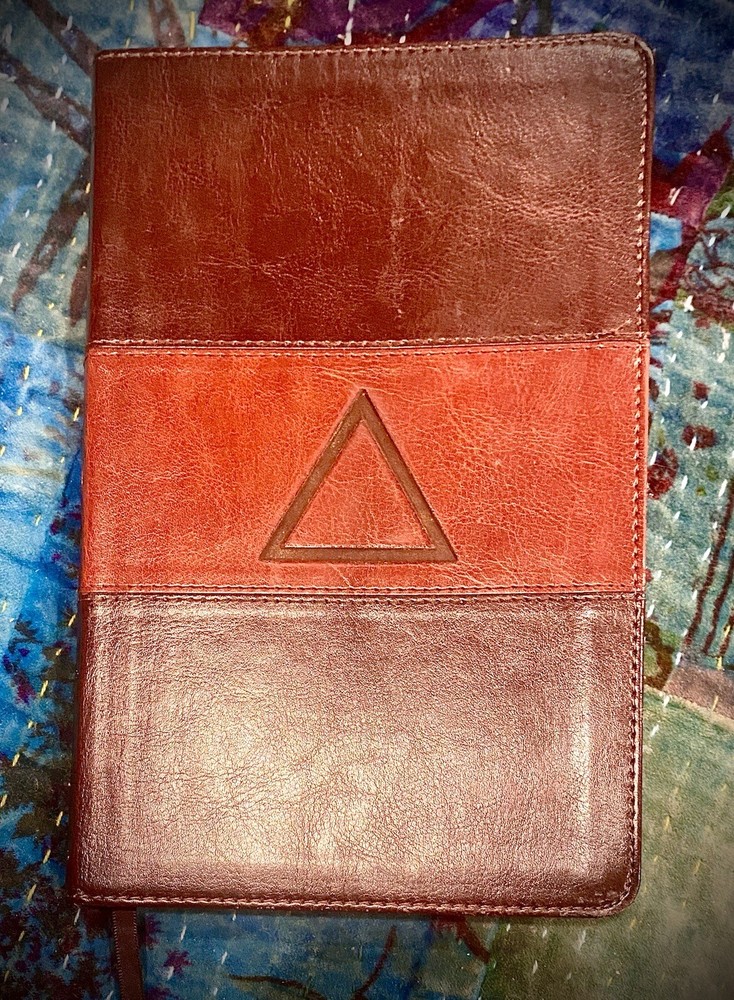 Solid, well-kept Crossway ESV Bible with rich leather-like Tru-tone cover is in excellent used condition with no tears, rips, holes, stains, missing pages or odors. Extensive personal dedication on inside front cover plus entries on dedication page and single entry in Records section appear to to be the only extraneous marks. Features include color-coordinated brown ribbon, Glossary and Maps section. Distinctive triangle symbol on front. Clean, cared-for Bible ships Media Mail from Los Angeles. Crossway English Standard Version ESV Study Bible TruTone w/Concordance, Maps.
