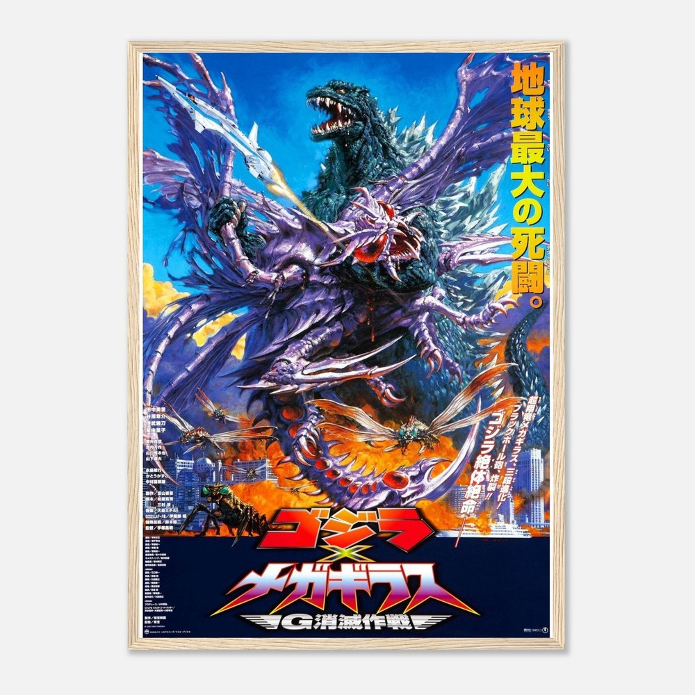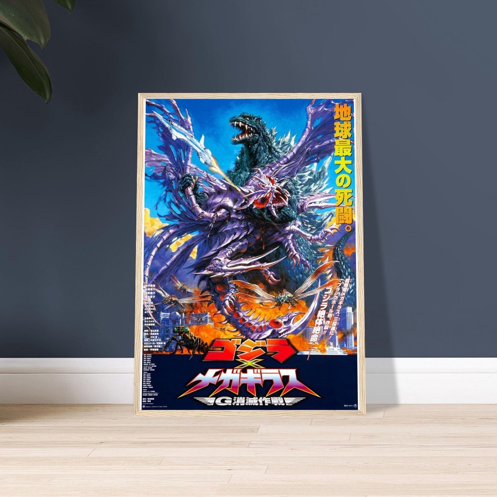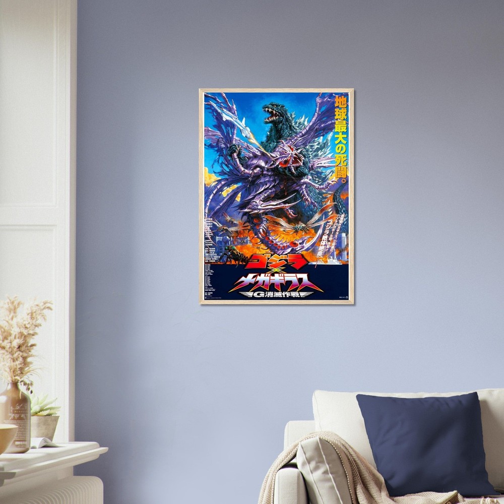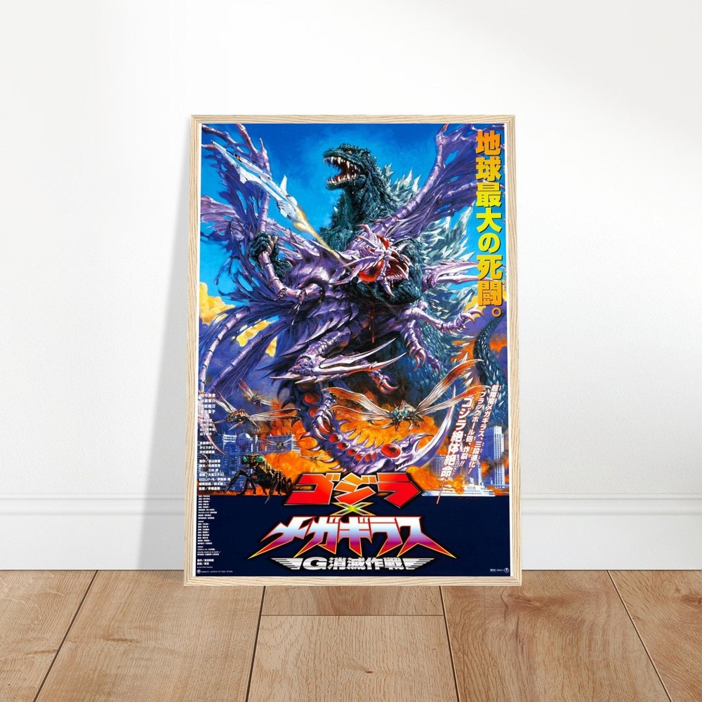 Dramatic Japanese movie poster artwork featuring an intense battle scene with Godzilla against a vibrant backdrop of electric blue sky. The dynamic composition shows the iconic monster amid swirling purple and orange energy effects, creating an explosive scene of kaiju action. Bold Japanese text and striking colors capture the essence of classic monster movie artistry --- Our sturdy wooden framed posters come ready to hang and are printed on heavyweight white matte paper with a smooth, luxurious finish—designed to stand the test of time: Ready-to-hang: Includes hanging kit, ready to hang directly on the wall. Frame Material: Durable pine wood. Frame Measurements: 20-25mm (0.79"-0.98") thick, 10-14mm (0.4"-0.6") wide. Paper Weight: 200 gsm (80 lb), thickness: 0.22 mm (8.7 mils). Paper Finishing: Matte, smooth, non-reflective surface. Protection: Shatterproof plexiglass protects the poster. Sustainable Paper: FSC-certified materials or equivalent.