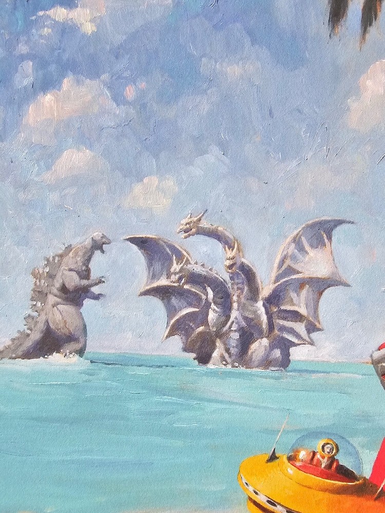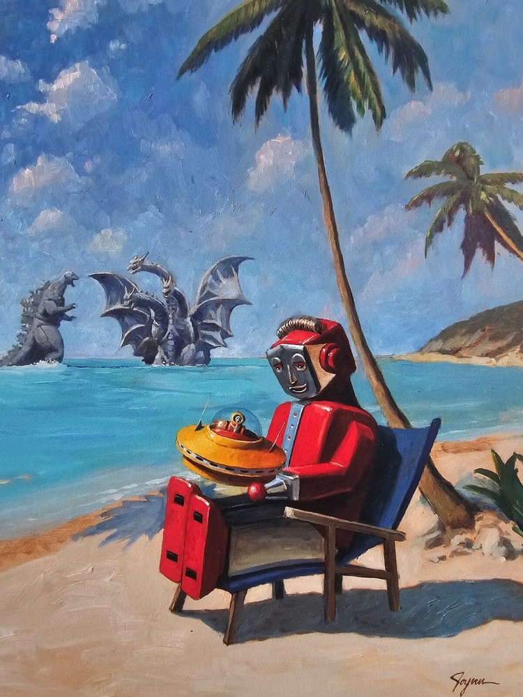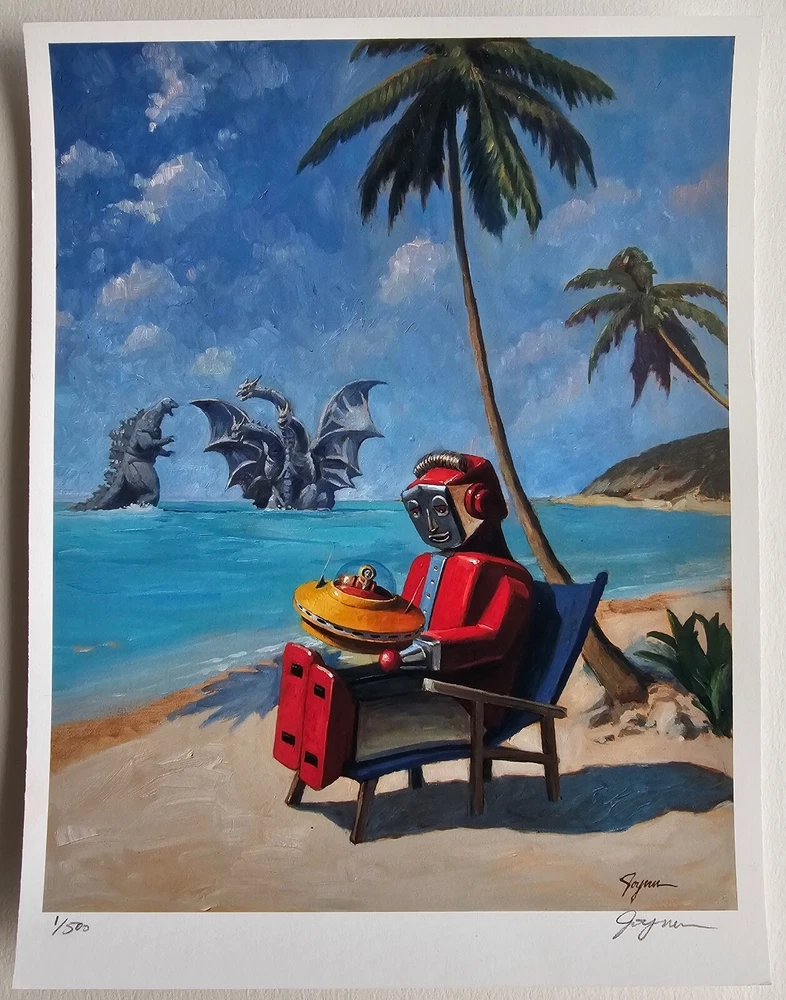 eric joyner "On the beach" Hand signed & numbered in pencil by the artist, Eric Joyner (also signed in print) Paper size approximately: 8.5 inches (21.6cm) x 11 inches (27.9cm) Printed by the artist on hot press bright paper with archival inks, from the original painting. Archival framing and placement away from direct sunlight is recommended. Inspired by Pop Culture; Godzilla, Robots, King Ghidorah, Beach, Vacation, Relaxation, Paradise, Palm trees, Comedy Eric joyner: "Joyner grew up in San Mateo, California, and spent some time in Medford, Oregon, after his family moved there. He was always interested in art and attended the Academy of Art University in San Francisco. He began working as a commercial illustrator in 1984 and created the cover art for several video games, such as Tales of the Unknown, Volume I: The Bard's Tale, Realm of Impossibility, and Archon II: Adept. In 1999, he chose to focus only on topics that he likes. He started painting with four different elements: Mexican masks, San Francisco city life, old newspaper cartoons and Japanese robots. He found that the robots were the most popular feature with his friends. He had been collecting toy robots for about 20 years and wanted to bring them to life. In 2002, he felt that he needed another element to work off of. Inspired by the film Pleasantville, in which Jeff Daniels paints donuts, Joyner added donuts. The donuts have been featured as both objects of desire and adversaries to the robots. Joyner paints approximately 20 paintings a year with his original works selling from anywhere from $3000 a piece to $75,000. George Lucas is one of his most famous buyers. Several of his paintings are used as set pieces in the TV show The Big Bang Theory. An adaptation of his 2007 work "The Collator", "Submerged", is featured on the album cover for the Ben Folds Five album The Sound of the Life of the Mind. His painting "Malfunction" is used on the cover of Robot Law, a scholarly volume on robotics law and policy edited by Ryan Calo, A. Michael Froomkin, and Ian Kerr." International shipping available! Colors of actual artwork may vary slightly from colors on your screen due to digital screen calibration varying between digital devices. International buyers are responsible for import duties, fees and taxes. See my other listings for more art. Thank you for looking!