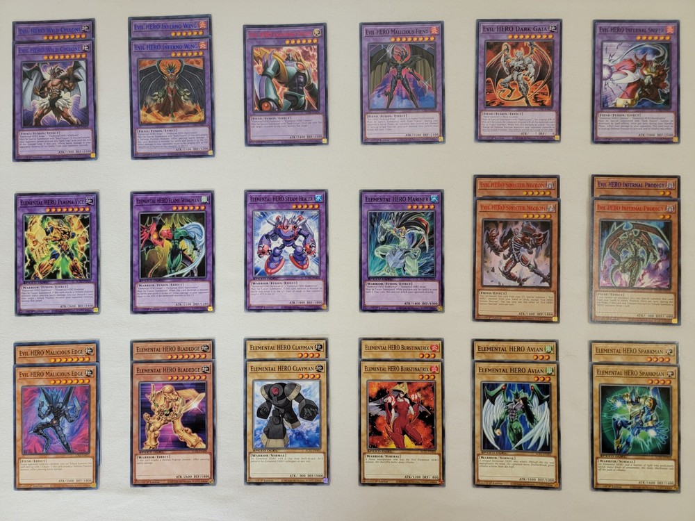 The deck consists of these cards : Evil HERO Malicious Bane x1 Evil HERO Wild Cyclone x2 Evil HERO Inferno Wing x2 Evil HERO Lightning Golem x1 Evil HERO Infernal Sniper x1 Evil HERO Dark Gaia x1 Evil HERO Malicious Fiend x1 Elemental HERO Plasma Vice x1 Elemental HERO Flame Wingman x1 Elemental HERO Mariner x1 Elemental HERO Steam Healer x1 Evil HERO Sinister Necrom x2 Evil HERO Infernal Prodigy x2 Evil HERO Malicious Edge x2 Elemental HERO Bladedge x2 Elemental HERO Clayman x2 Elemental HERO Burstinatrix x2 Elemental HERO Avian x2 Elemental HERO Sparkman x2 Elemental HERO Wildheart x2 Elemental HERO Bubbleman x2 Winged Kuriboh x2 Dark Fusion x2 Dark Calling x2 Evil Mind x2 H - Heated Heart x2 Expendable Dai x2 Broken Line x2 Back to the Front x2 Necro Fusion x2