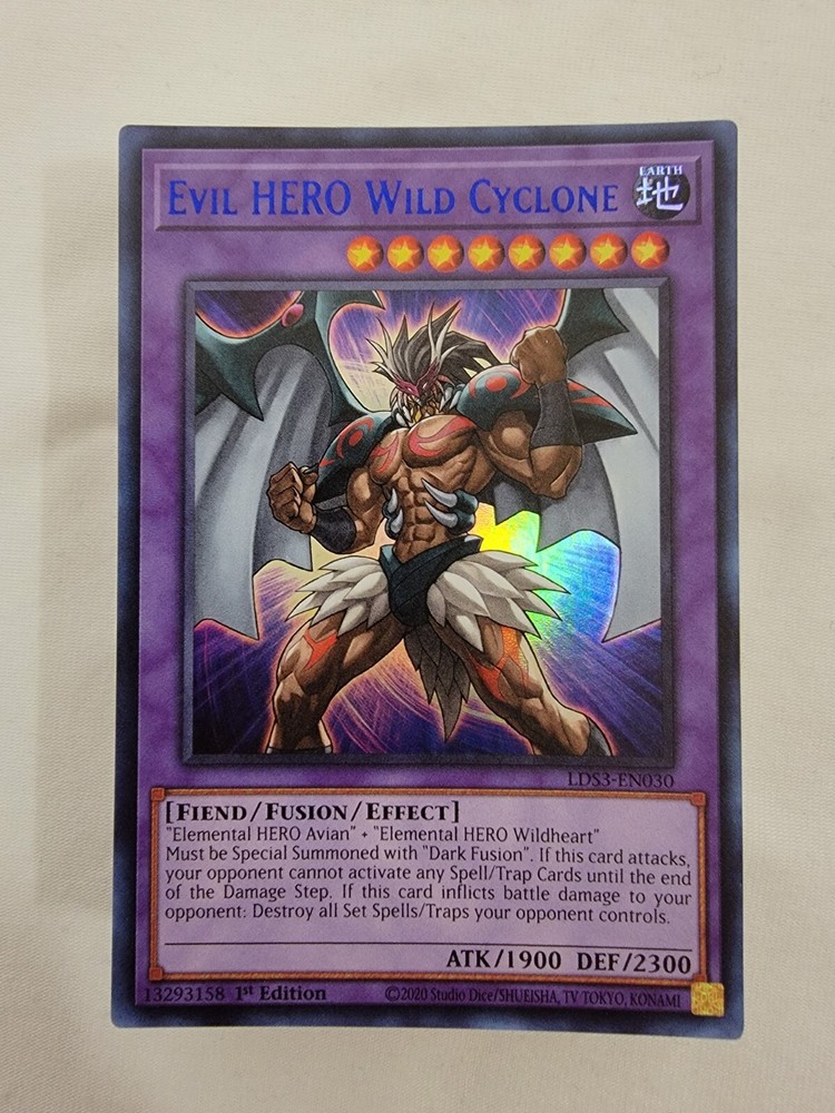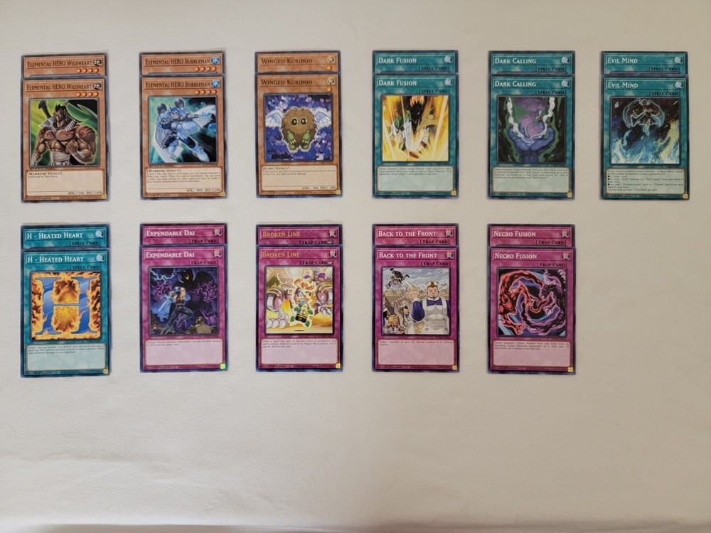 The deck consists of these cards : Evil HERO Wild Cyclone x2 Evil HERO Inferno Wing x2 Evil HERO Lightning Golem x1 Evil HERO Infernal Sniper x1 Evil HERO Dark Gaia x1 Evil HERO Malicious Fiend x1 Elemental HERO Plasma Vice x1 Elemental HERO Flame Wingman x1 Elemental HERO Mariner x1 Elemental HERO Steam Healer x1 Evil HERO Sinister Necrom x2 Evil HERO Infernal Prodigy x2 Evil HERO Malicious Edge x2 Elemental HERO Bladedge x2 Elemental HERO Clayman x2 Elemental HERO Burstinatrix x2 Elemental HERO Avian x2 Elemental HERO Sparkman x2 Elemental HERO Wildheart x2 Elemental HERO Bubbleman x2 Winged Kuriboh x2 Dark Fusion x2 Dark Calling x2 Evil Mind x2 H - Heated Heart x2 Expendable Dai x2 Broken Line x2 Back to the Front x2 Necro Fusion x2