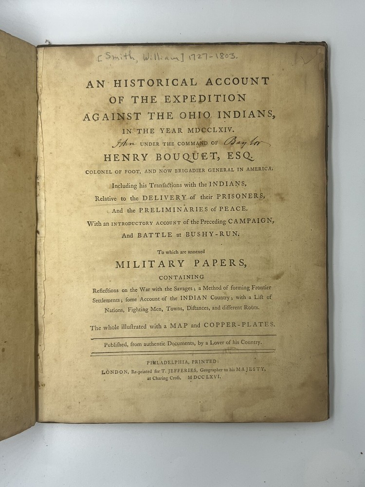Here’s another rare early American gem. 1st edition, however, missing the important map and 2 plates and front cover detached, priced accordingly. Included is a copy of the 1868 edition containing the map and plates. An Historical Account of the Expedition Against the Ohio Indians, in the Year 1764, under the Command of Henry Bouquet, Esq… further, it is inscribed as John Baylor’s copy, which considering the importance of the work – I believe this copy belonged to John Baylor (1750-1808), in which his younger brother was George Baylor, George Washington’s aide-de-camp during the Revolutionary War.
