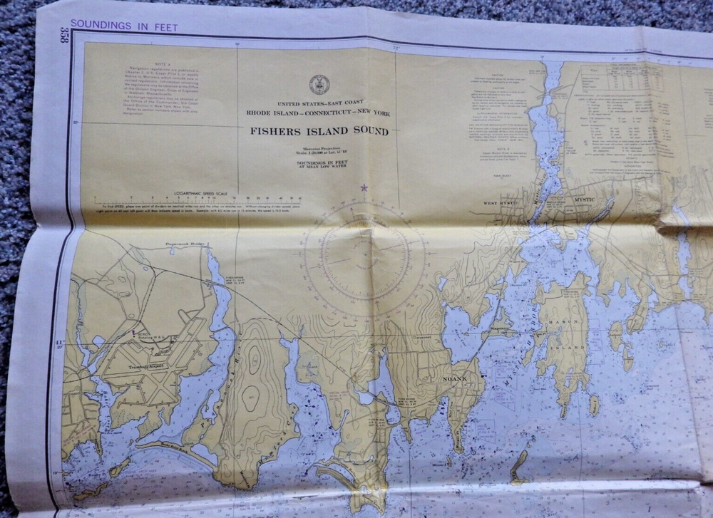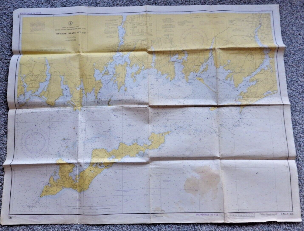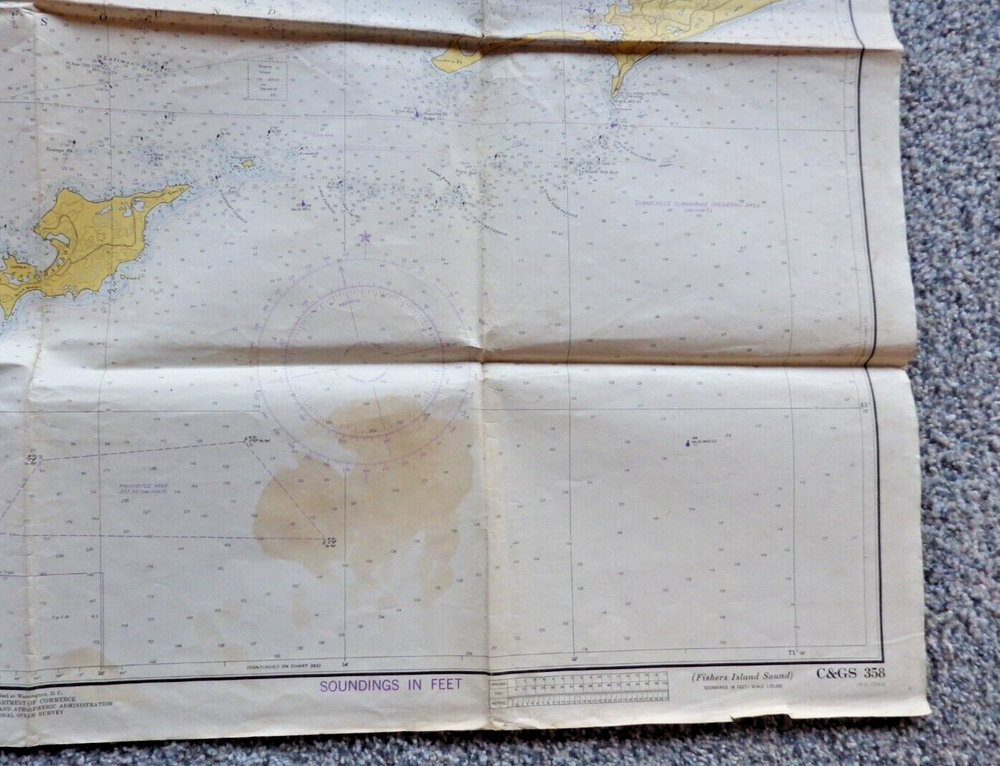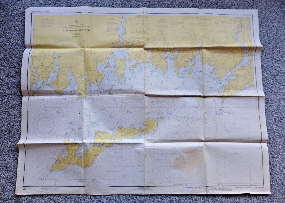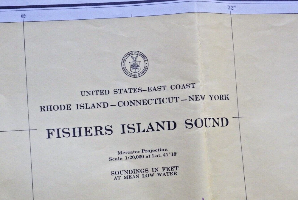 This vintage nautical chart from 1942 edited in 1972 depicts Fisher Island Sound and was made by the U.S. Department of Commerce. It's a piece of history that will add character to any collection. The chart is in its original form, showcasing the beauty of the United States' maritime landscape. Whether you're a collector or just love the sea, this vintage nautical chart is a must-have. It's a vintage original and would make a great addition to any maritime or antique collection. Very cool item to frame and display. Shows all of Fisher Island, Mystic Connecticut, Stonington, Pawcatuck River and more. Published by the U.S. Department of Commerce at Washington D.C., Coast and Geodetic Survey, revised 10/21/72 18th edition. Size is 42 inches wide by 33 inches top to bottom. See pictures for some wear, stains, and possible small tears. This is an authentic original chart, so it'll have writing on the outside, stamp marks, some nice vintage colors, and slightly tinted paper patina. This will be shipped flat in a 12 x 10 envelope. I