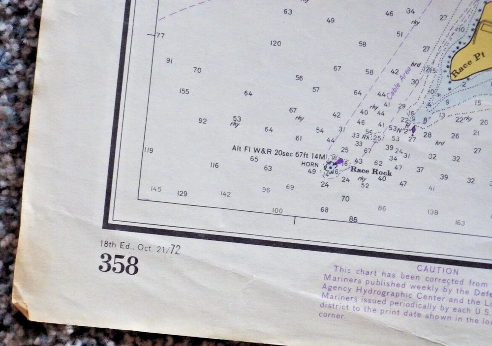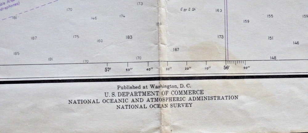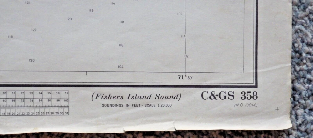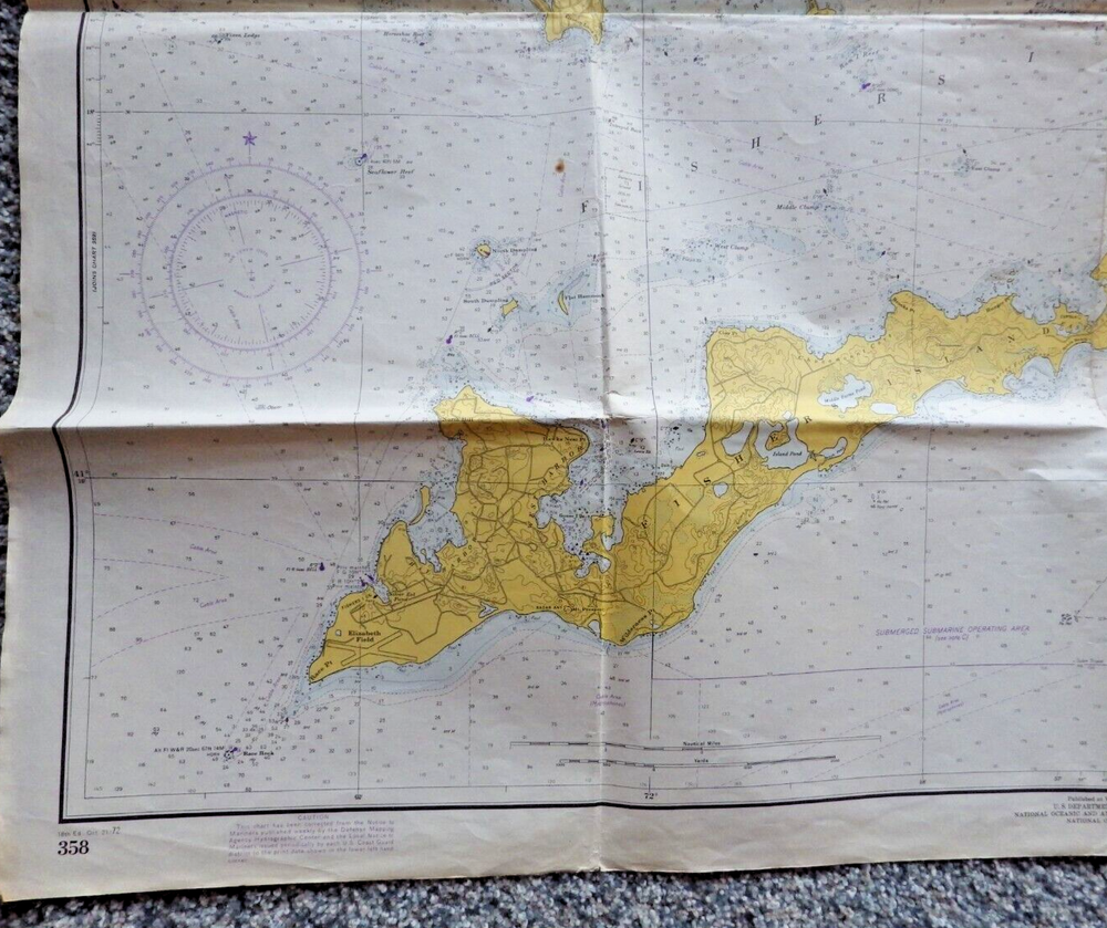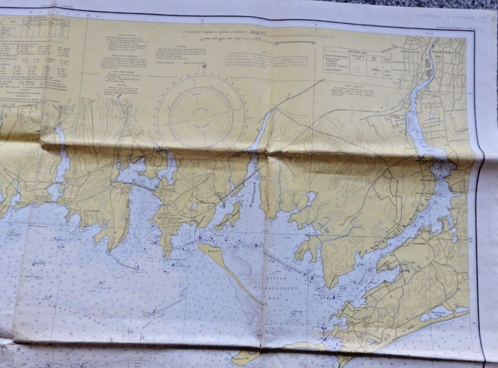 This vintage nautical chart from 1942 edited in 1972 depicts Fisher Island Sound and was made by the U.S. Department of Commerce. It's a piece of history that will add character to any collection. The chart is in its original form, showcasing the beauty of the United States' maritime landscape. Whether you're a collector or just love the sea, this vintage nautical chart is a must-have. It's a vintage original and would make a great addition to any maritime or antique collection. Very cool item to frame and display. Shows all of Fisher Island, Mystic Connecticut, Stonington, Pawcatuck River and more. Published by the U.S. Department of Commerce at Washington D.C., Coast and Geodetic Survey, revised 10/21/72 18th edition. Size is 42 inches wide by 33 inches top to bottom. See pictures for some wear, stains, and possible small tears. This is an authentic original chart, so it'll have writing on the outside, stamp marks, some nice vintage colors, and slightly tinted paper patina. This will be shipped flat in a 12 x 10 envelope. I