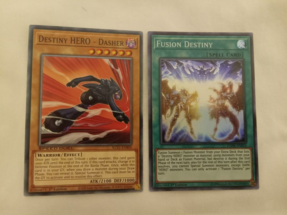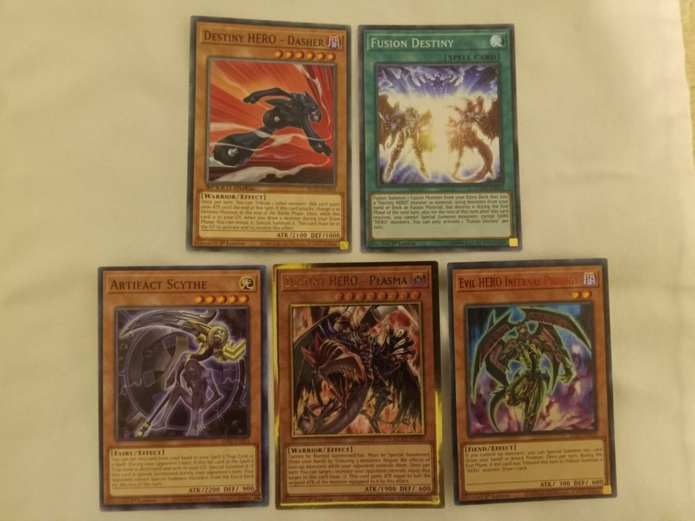 FUSION DESTINY SUPER RARE DESTINY HERO DASHER PLASMA INFERNAL PRODIGY SCYTHE DPE AS SHOWN PICTURES: ALL CARDS ARE IN NEAR MINT, GREAT CONDITION! FUSION DESTINY (SUPER RARE) DESTINY HERO - DASHER (COMMON) DESTINY HERO - PLASMA (GOLD RARE) EVIL HERO INFERNAL PRODIGY (ULTRA RARE, RED LETTERING) ARTIFACT SCYTHE (COMMON) ALL orders from my store will be shipped in a small envelope WITH tracking shipped with an eBay standard envelope tracking label. See shipping price! Handling time is 2 days, and then the item will be shipped immediately!