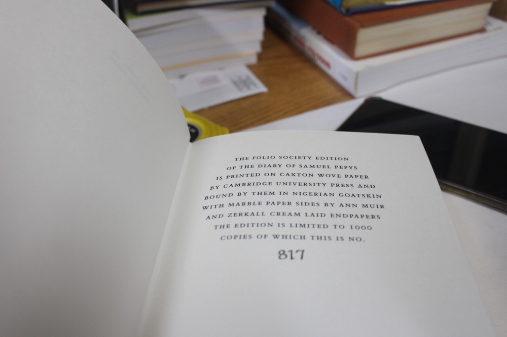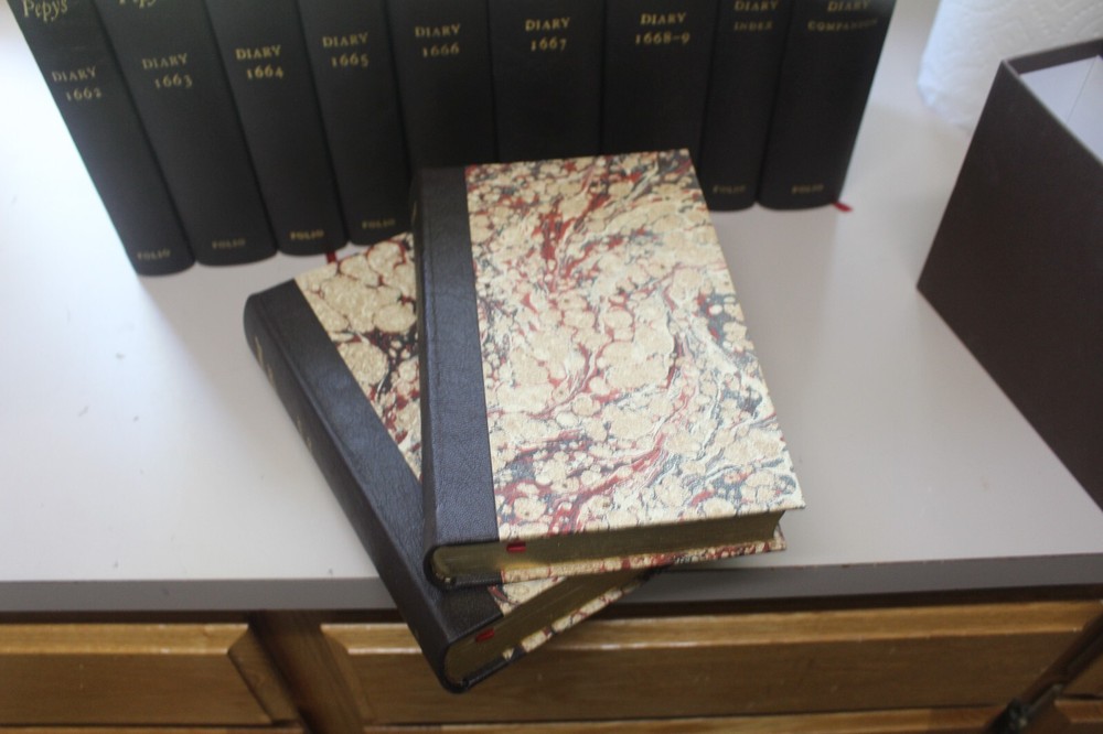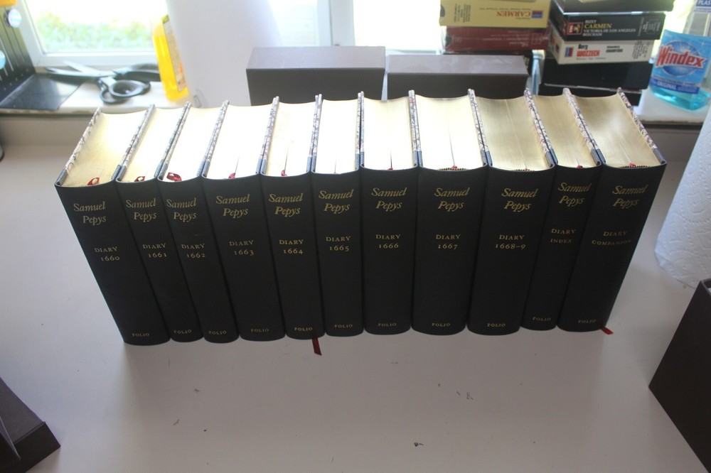 Folio Society-Diary of Samuel Pepy- 11 vols-Limited VG 1/2 leather w/ Slipcases. Limited to 1000 copies, this is number 817. No names or writing. Gold gilt all around.A very nice set with a couple of small flaws. Volume 5 has some straching to the gilt, and the back left corner to the slipcase for the Index is bumped pretty badly. See the last two photos. Overall a very nice set. Will ship in two boxes eiher isured Media or Ground Advantage depening on where you live.