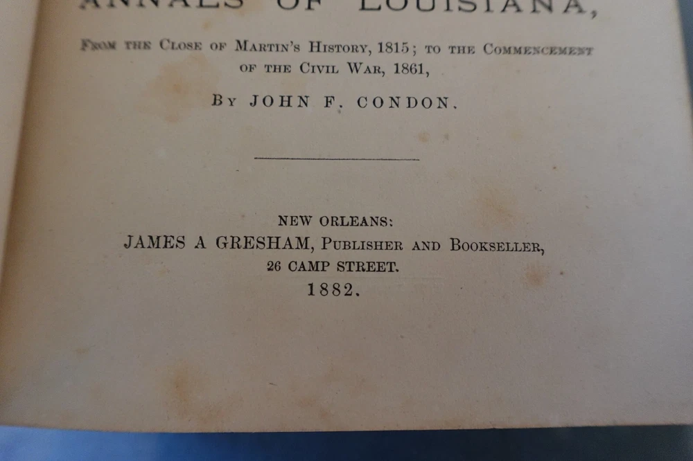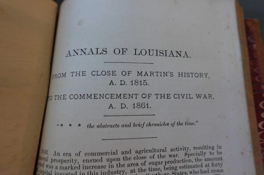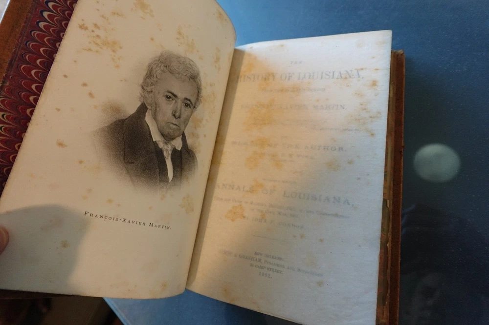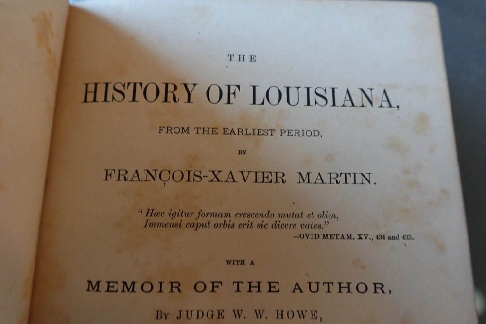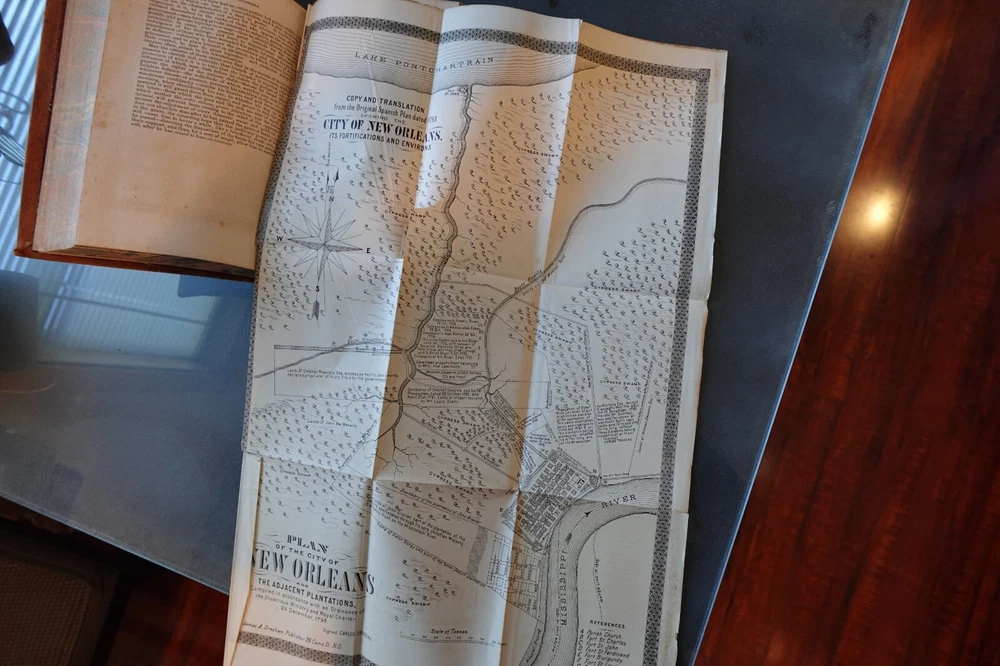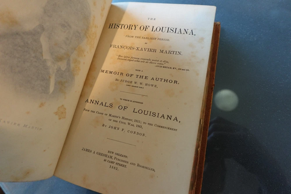 MARTIN'S HISTORY OF LOUISIANA 1882 with a Memoir of the author, by Judge W. Howe Hardback, Leatherbound, with full page portrait of Francois-Xavier Martin, with original protector sheet. Absolutely gorgeous FOLD OUT MAP of New Orleans and the Mississippi River, Lake Pontchartrain, etc. Quite a rare and neat book of history.