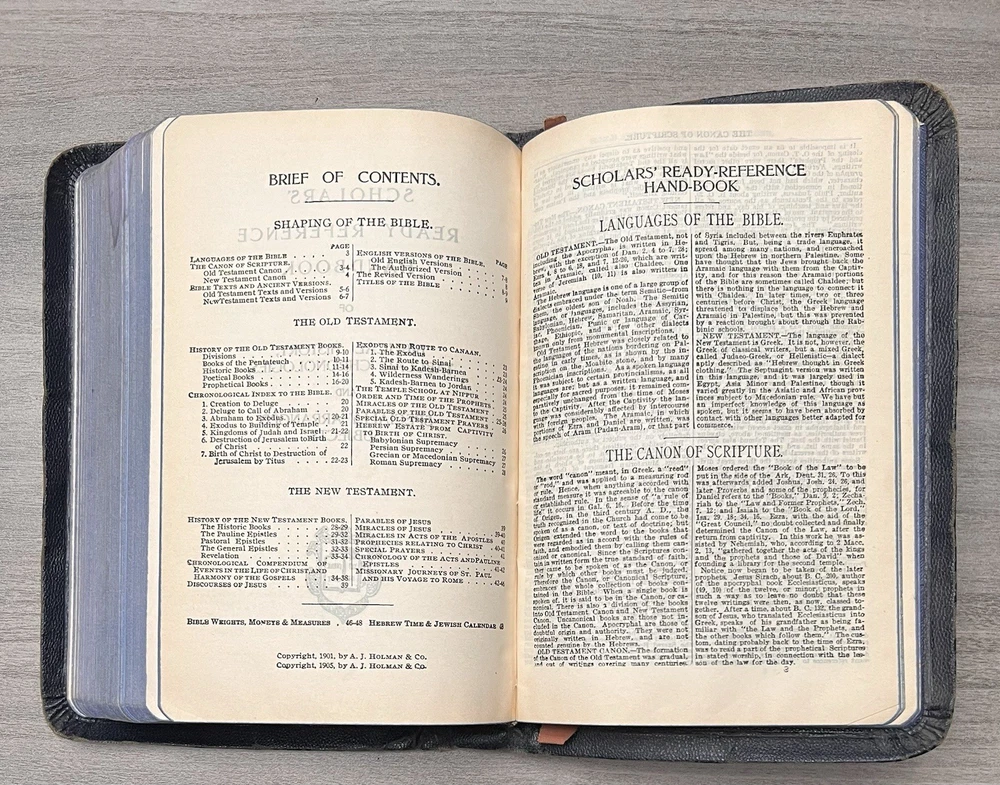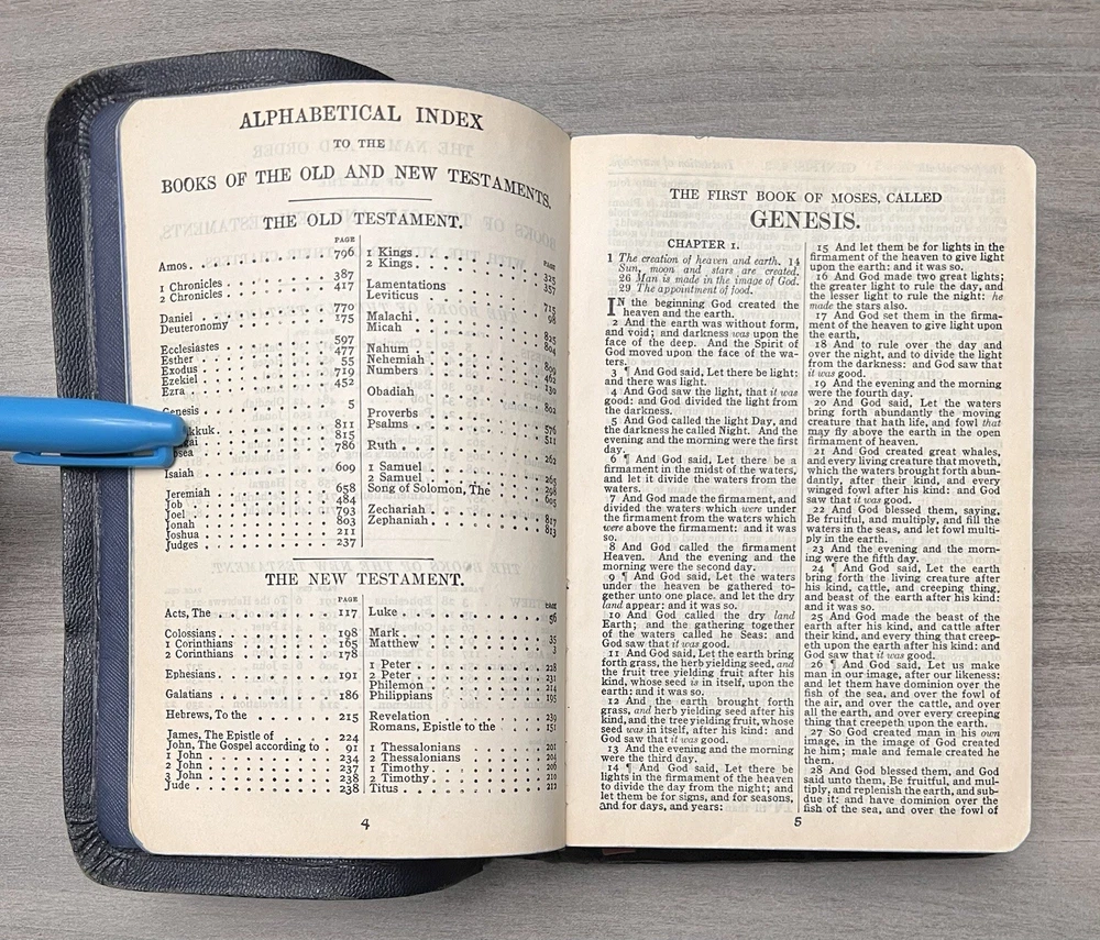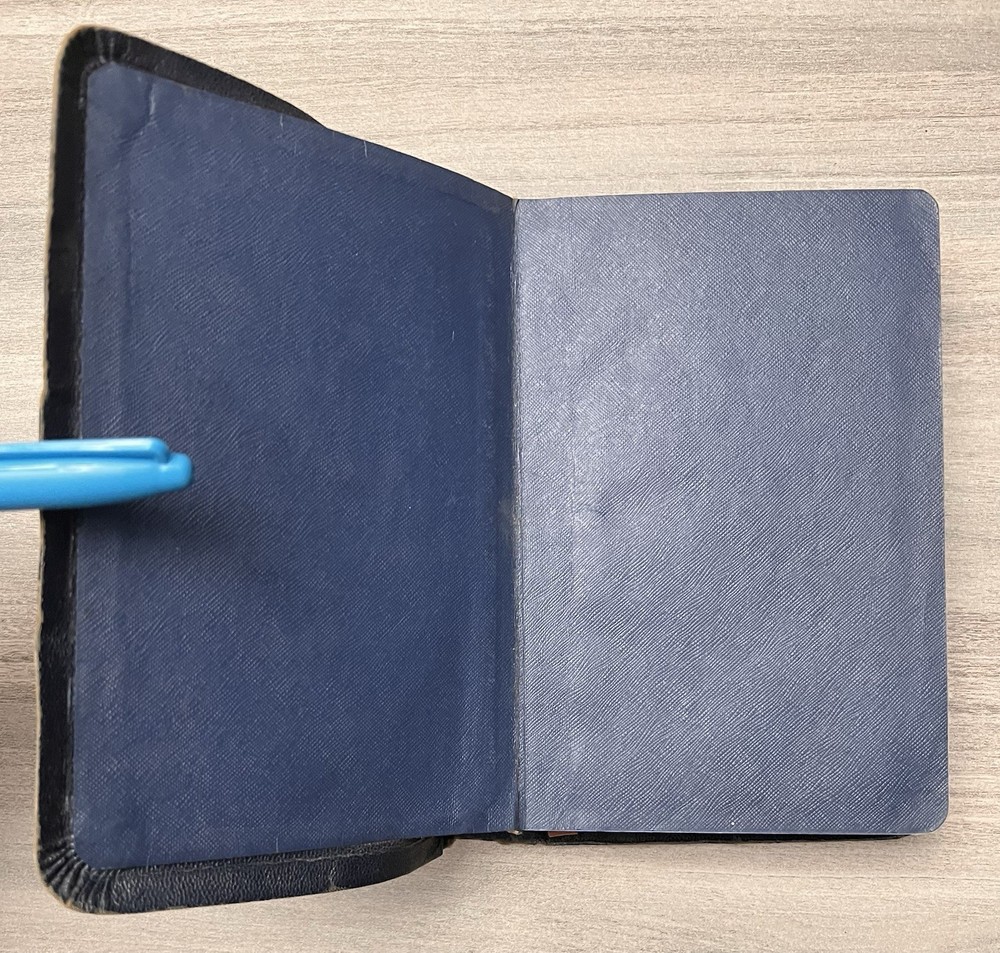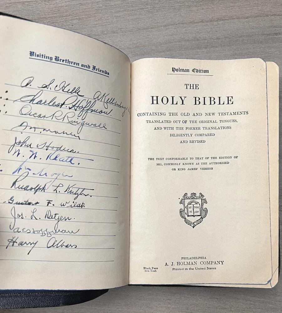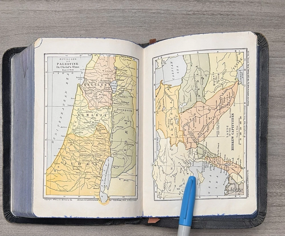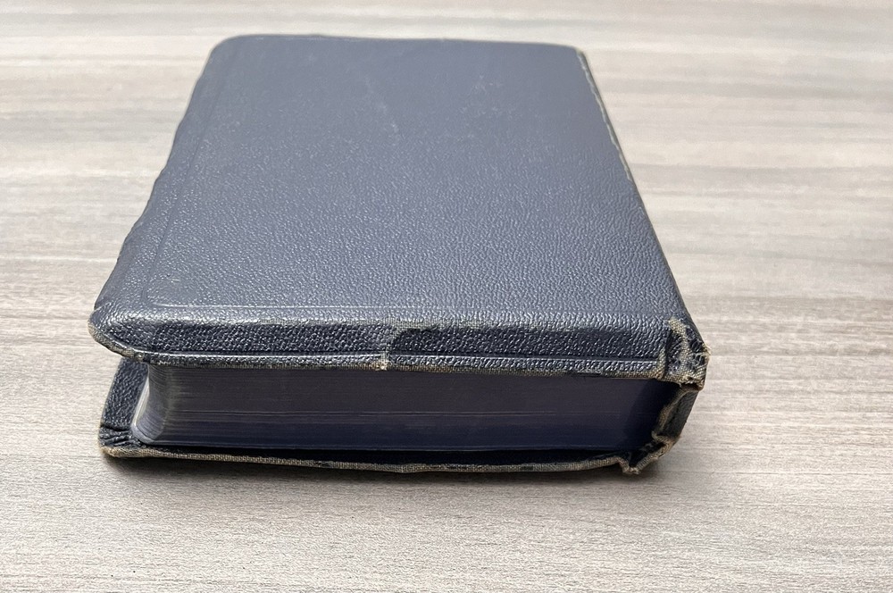 Holman KJV Hand Size Bible - 1939 - Navy Leather Softcovers Azure Lodge No. 868, F. & A.M. - Signatures - Family Records Notes: I rated this Bible in good condition . Expect general aging, shelf wear and usage for a Bible published in 1939 (based on date stamped in Bible). Cover wear (see photos). Some page stains. Clean text. No highlighting, no marks, and no underlining, no written comments. Solid sewn page binding. Rare Azure Lodge stamped Bible. Please view the photos for examples of content and condition. Thanks! Dimensions: ~7.88" x ~5.25"; width = ~1.25" Pages: pre-Genesis pages + 827 for O.T. + 255 for N.T. + 14 + 48 + 4 Color Maps Visit our Ebay Store for more books like this one. Our books are sold as-is. Please email any questions prior to purchasing. Thanks!