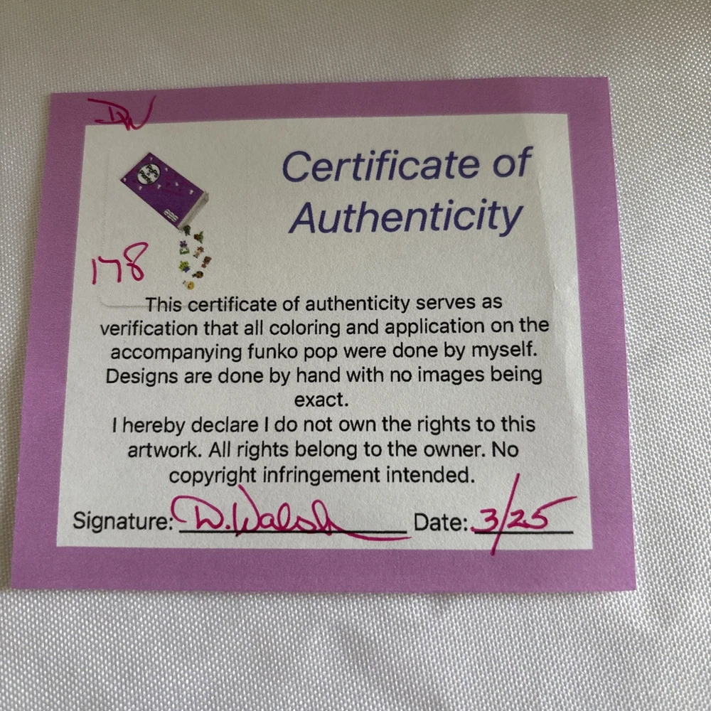 Funko Pop! Custom artwork created and signed by D. Walsh on funko pop as shown. Ships in Plastic protector. Includes COA by Artist. Each piece is done by hand using POSCA paint pens. Shipping discount for multiple custom artwork bought. Includes the original funko pop as listed on the box. All funko pops are new, only removed from packaging to paint. Boxes may have slight shelf wear. COA I hereby declare I do not own the rights to this artwork. All rights belong to the owner. No copyright infringement intended. Each COA is individually numbered with month/year created. Smoke free home. Commissions/requests are available