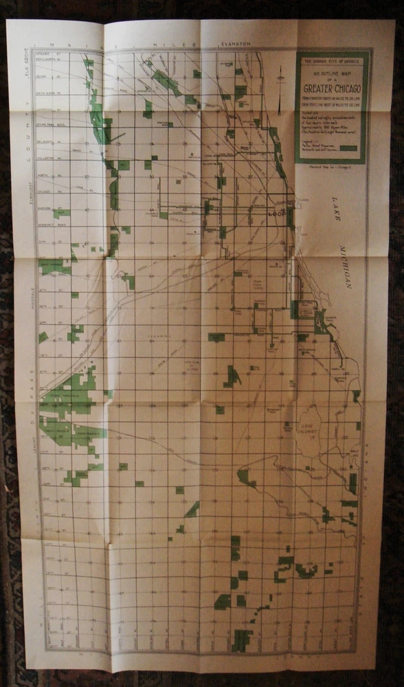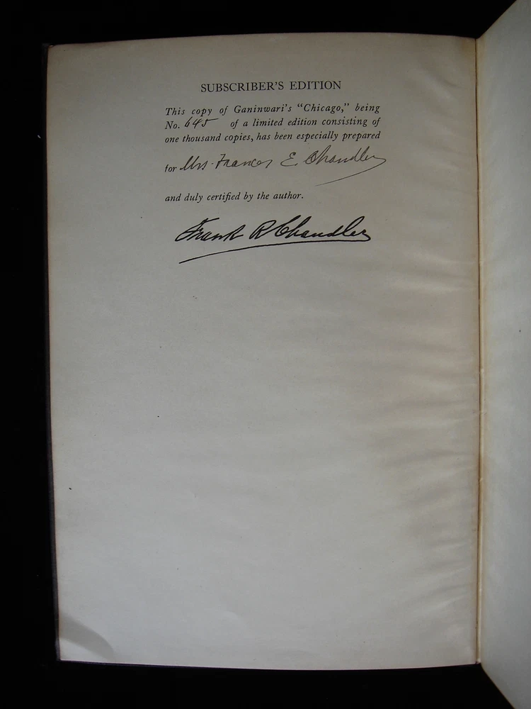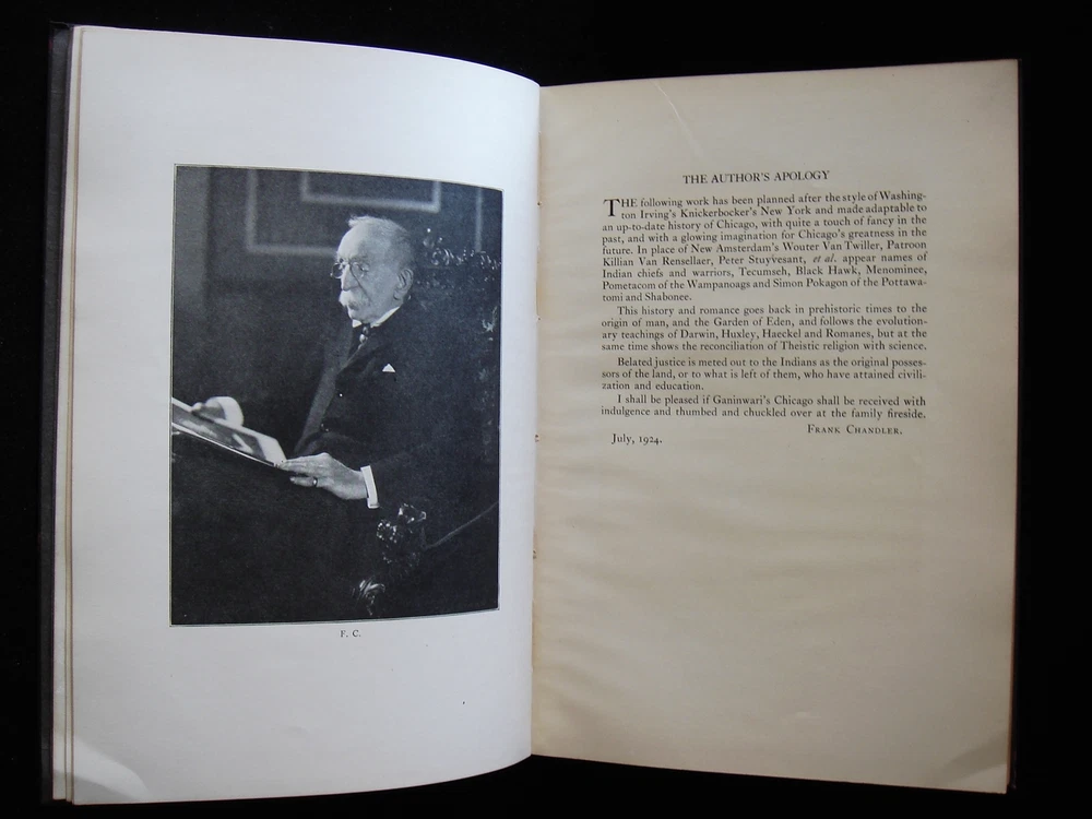 GANINWARI'S CHICAGO Scarce Map of Chicago SIGNED by Frank Chandler 645/1000 Product Description Che-Cau-Gou: A History, A Romance. In the Evolution of a Great City from the Garden of Eden to the End of The Twentieth Century by Onkwe Gainwari From the author: "The following work has been planned after the style of Washington Irving's Knickerbocker's New York and made adaptable to an up-to-date history of Chicago." An entertaining and humorous look at the history of Chicago, including a look to the future. Includes numerous illustrations of people, places and things. 137 pages + index. 7 x 10 inches. Includes a scarce, lovely, large (40" x 22") map of Chicago , neatly folded and inserted in book. This is hand-numbered as #645 of 1000 printed. Presentation name and Chandler's signature are included. Published by: The Faithorn Company, Chicago, IL. 1924 Softback is overall in VERY GOOD condition. Professionally re-cased in black leather, preserving original title blocks and spine text. Title blocks are a red leather with bright gilt. Leather covers are rubbed in places, exposing original red beneath it. Front lower corner appears to have been dropped, with crease to cover that continues through first half of book, fading as it goes along. Inside pages are lightly toned, and free of marginalia and underlining. Printing of type and illustrations is clear. Map is free of writing. Creases of map exhibit light toning, and paper is separating at creases in some places. Book may exhibit other minor signs of wear and aging. CR20150909 AS IS! Please see photos. More photos available upon request. International first class shipping includes a handling charge to cover insurance. Domestic orders over $250 include a handling charge to cover signature confirmation. When you buy from us, we would greatly appreciate positive feedback to add to our ratings! Thank you in advance! We encourage you to contact us with any questions! We also welcome additional information on any of our listings. Other shipping options may be available. Please contact us for more details and information. Pickup is also welcome! Orders ship within 2 business days of receipt of payment, unless otherwise notified. Payment is due within 2 days of auction end to guarantee availability and price. International Buyers: Import duties, taxes and charges are not included in the item price or shipping charges; these charges are the BUYER's responsibility. FULL VALUE will be declared on all overseas items. If your order hasn't arrived, or isn't as described, please contact us and we'll work with you to find a satisfactory resolution! Thank you for your interest in this listing! Launched from my store - Powered by Highwire.com