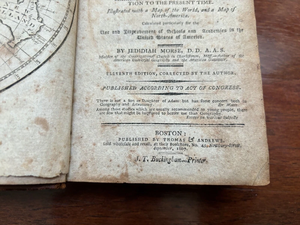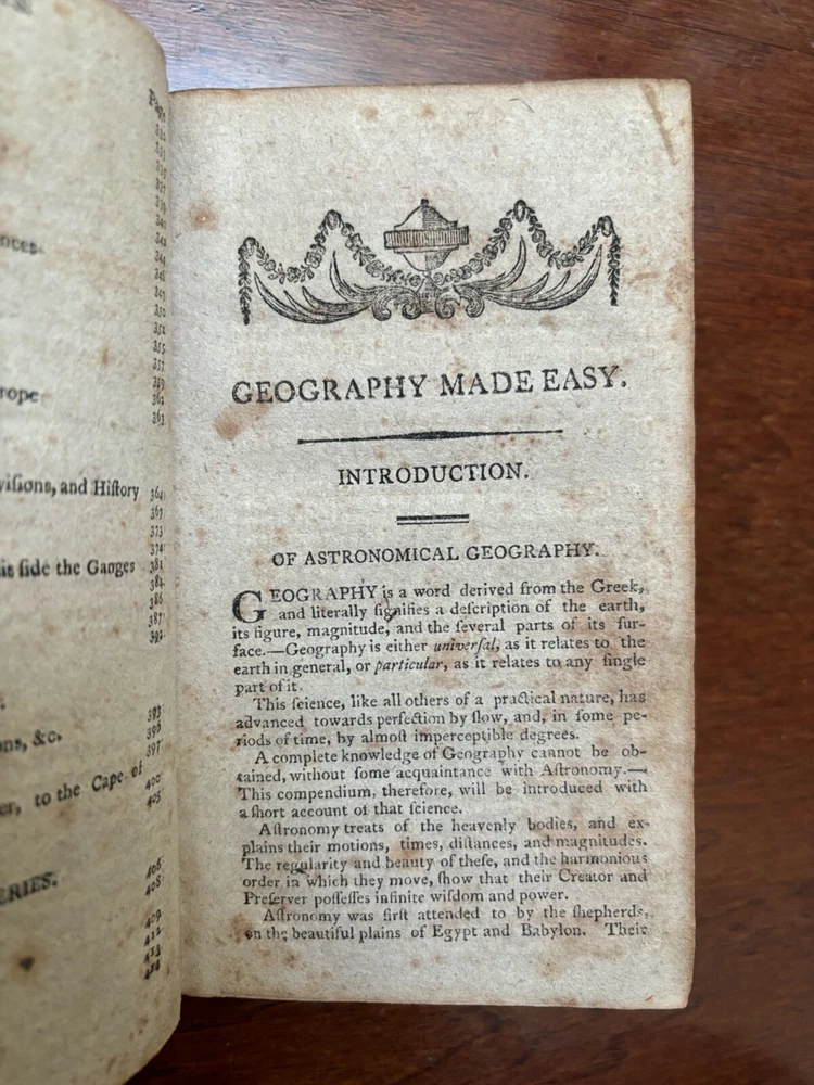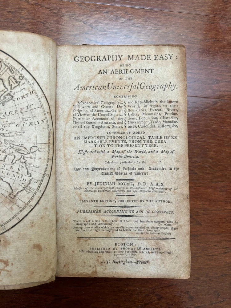 Geography Made Easy: Being An Abridgment of the American Universal Geography by Jedidiah Morse Both folding maps are complete and present and solidly attached --- Map of the World faces the title page and Map of North America at p. 50 Good condition --- covers solidly attached --- book is nearly 220 years old and shows signs of handling and time Thomas & Andrews --- 1807 --- 11th edition Leather bound --- gold lettering and tooling and red title box on spine Cover with shelf wear, scuffing, bumping and wear at corners --- some wear to gilt on spine Soiling to edges of page block --- previous owner's name in ink on FFEP --- endpaper creases Both maps with creasing, light edge wear, foxing/toning 432 pp. --- pages unmarked --- no loose or missing pages Toning and foxing throughout --- infrequent corner/edge creases Around 4 1/2" x 7" Will be securely bubble wrapped in a box and shipped via USPS Media Mail [CD]