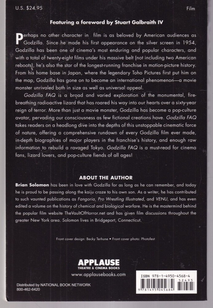 GODZILLA FAQ: ALL THAT'S LEFT TO KNOW ABOUT THE KING OF THE MONSTERS By Brian Solomon (2017 Trade Paperback){G3} The top of the books' spine is banged, this is a new and unread book damaged in the shop. Most of our books are new, damaged and sometimes remaindered stock. Many times there will be a remainder mark of some sort on the top or bottom edge of the book. Please view photos if this is a concern as we try to include a pic of this when possible.