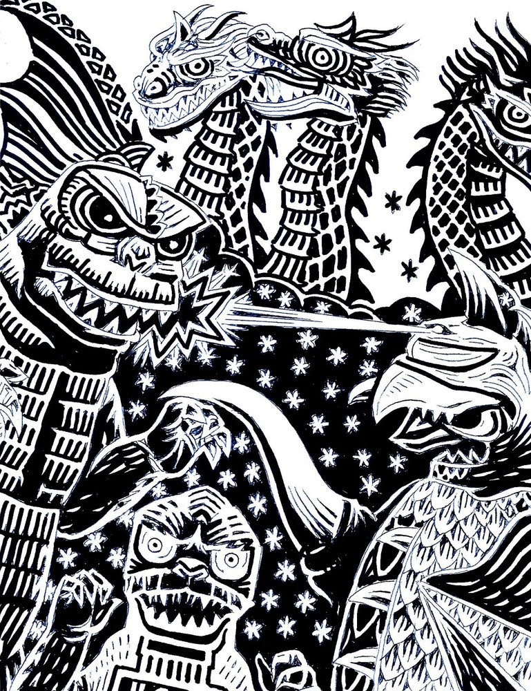 UP FOR SALE IS A HAND DRAWN ONE OF A KIND ORIGINAL COMIC ART BLACK INK SKETCH OF GODZILLA AND THE SON OF GODZILLA VERSUS GIGAN AND KING GHIDORA ( MONSTER ZERO) DONE IN A STYLIZED TIKI STYLE ART EMULATING A WOOD CUT FEEL OF RENDERING IN THIS HIGHLY DETAILED FINE ART ON 8 1/2'' X 11'' CARD STOCK BY COMIC BOOK ARTIST JAMES CHEN WHO DID THE ARTWORK FOR FIST OF THE DRAGON # 1,2,3 & 4 AND LADY DRAGON # 0. THE ARTWORK IS SIGNED BY THE ARTIST O THE BACK. PLEASE NOTE SCAN COLORS MAY BE LIGHTER OR DARKER THAN THE ACTUAL ART. I DO NOT ACCEPT RETURNS IF SCAN COLORS ARE A LITTLE LIGHTER OR DARKER THAN THE ACTUAL ART OR FOR ANY OTHER REASONS. THE ARTWORK IS SOLD AS IS. I DO NOT ACCEPT RETURNS. JAMES CHEN IS AS FAR AS I KNOW CURRENTLY THE ONLY ARTIST DOING COMIC COVER RECREATIONS ON 8 1/2'' X 11'' CARD STOCK. HE HAS BEEN DOING THEM FOR THE PAST 12 YEARS.MOST OTHER ARTISTS DO COVER RECREATIONS ON 11 X 17'' CARD STOCK BECAUSE THIS IS THE SIZE THE COMIC INDUSTRY USES FOR ACTUAL COMIC PRODUCTION ART TO DO ART BIGGER TO GET IN ALL THE MINUTE DETAILS AND SHRINKS THE IMAGE TO THE SMALLER COMIC SIZE. BUT IT IS ACTUALLY A LOT HARDER TO DO COVER RECREATIONS IN THE 8 1/2'' X 11'' CARD STOCK BECAUSE IT IS MUCH HARDER TO DRAW THE TINY DETAILS IN HALF THE PAPER SIZE. COVER RECREATIONS IN THE 8 1/2'' X 11'' CARD STOCK SIZE IS MUCH BETTER ALSO BECAUSE IT IS CLOSER TO THE ACTUAL SIZE OF A ACTUAL COMIC BOOK COVER. JAMES CHEN HAS ALREADY DONE AND SOLD NEARLY 10,000 BLACK INK 8 1/2'' X 11'' COMIC COVER RECREATIONS AND DONE NEARLY 1000 SO FAR OF THE COLOR COVER RECREATIONS. COLOR COVER RECREATIONS TAKE AROUND 12 HOURS TO DO. MY HOPE IS THESE COVER RECREATIONS WILL BRIDGE THE GAP BETWEEN FINE ART AND POP ART AND COMIC ART THE WAY ARTISTS ROY LICHTENSTEIN AND ANDY WARHOL DID WITH THEIR COMIC ART IN THE 1960'S AND THAT EVENTUALLY THESE TENS OF THOUSANDS OF COVER RECREATIONS DONE BY JAMES CHEN WILL BE IN MUSEUMS DEFINING POP ART AND COMIC ART FOR THIS GENERATION. WARHOL'S ART WAS $200 WHEN THEY CAME OUT IN THE 1960'S AND ARE NOW SELLING FOR AROUND $30 MILLION EACH. MY HOPE IS WHEN PEOPLE REALIZE HOW GREAT THESE COLOR COVER RECREATIONS THAT TAKE 12 HOURS LONG TO DO AND HOW GREAT THESE BLACK INK COVER RECREATIONS THAT TAKE 5 HOURS TO DO ARE THESE ARTS WILL ONE DAY BE IN A MUSEUM LIKE THE WORK OF ANDY WARHOL AND ROY LICHTENSTEIN AND LIKE THE ARTWORK OF JAMES CHEN'S FATHER ALBERT CHEN. BUYING A JAMES CHEN ORIGINAL ARTWORK IS POTENTIALLY A GREAT LONG TERM INVESTMENT. IN 1964 ANDY WARHOL'S YELLOW BRILLOW BOX SCULPTURES SOLD FOR JUST $200. BUT ONE SOLD FOR $3 MILLION IN 2010 & SOME OF HIS PAINTINGS SELL NOW FOR $30 MILLION. IN 1993 I HELPED MY FRIEND DAVE COCKRUM OUT BY BUYING HIS ART PAGES FOR $30 A PIECE. BUT I HAD A HARD TIME RESELLING THEM TO DEALERS FOR EVEN $30 FOR YEARS EVEN THOUGH HE WAS THE CREATOR OF THE NEW X-MEN & CHARACTERS LIKE STORM & COLOSSUS. HE WAS NOT APPRECIATED IN HIS LIFETIME AS AN ARTIST. BUT HIS ARTWORK PRICES SKYROCKETED IN 2006 AFTER HIS DEATH WITH THE FEW PAGES OF ART I HAD LEFT FROM HIM SELLING FOR UP TO $500 A PIECE. VAN GOGH DID NOT SELL A SINGLE PAINTING IN HIS LIFETIME, BUT NOW HE IS CONSIDERED AS ONE OF GREATEST ARTISTS OF ALL TIME WITH HIS WORK SELLING FOR UP TO $50 MILLION. JAMES CHEN WORKED AS A FASHION DESIGNER FOR MANY YEARS CREATING AROUND 250,000 DESIGNS IN HIS CAREER USED TO MAKE ABOUT 250 MILLION PIECES OF CLOTHING GENERATING ABOUT $10 BILLION IN RETAIL SALES WORKING AS THE HEAD DESIGNER FOR FASHION COMPANIES SUCH AS BY DESIGN, SPORT-ELLE, TIARA AND CRYSTAL KOBE. SO MORE PEOPLE WORE CLOTHING CREATED BY JAMES CHEN THAN PROBABLY ANY OTHER DESIGNER EVER. JAMES CHEN ALSO OWNED THE PUBLISHING COMPANY DRAGON COMICS AND WAS THE ARTIST OF COMICS SUCH AS FIST OF THE DRAGON #1,2,3,& 0, LADY DRAGON #1, DRAGON & THE WARRIORS. JAMES CHEN IS ALSO THE SON OF FAMED ARTIST SUI KANG CHEN OR ALBERT CHEN WHOSE CHINESE PAINTINGS ARE HANGING IN MUSEUMS ALL OVER THE WORLD. AFTER RETIRING FROM BEING A FAMED FASHION DESIGNER JAMES CHEN TRANSITIONED INTO A FINE ARTIST 12 YEARS AGO DOING SMALL SKETCHES IN MARKER AND COLOR PENCILS , AND SCULPTURE, AND HUGE PAINTINGS AS LARGE AS 8 FEET TALL IN EVERY MEDIUM FROM WATERCOLOR PAINT, ACRYLIC PAINT, OIL PAINT AND TEMPERA PAINT. JAMES CHEN HAS ALSO VOLUNTEERED HIS TIME TO DO DOZENS OF MURALS FOR SCHOOL AUDITORIUMS AND SCHOOL CAFETERIAS SUCH AS 4 TWENTY FOOT TALL CANVASES WITH PROFILES OF ALL THE AMERICAN PRESIDENTS FOR ONE SCHOOL AND 6 FOOT MURALS OF NATURE SCENES SUCH AS PEACOCKS FOR ANOTHER SCHOOL CAFETERIA. JAMES CHEN EVEN PAINTED A LIFE SIZE PARK SCENE WITH DOZENS OF CHILDREN ON THE INSIDE WALL OF A SCHOOL THAT WAS THE LENGTH OF A CITY BLOCK. IN THOSE 12 YEARS HE HAS BECOME THE MOST PROLIFIC ARTIST IN THE WORLD SELLING NEARLY 20,000 PIECES OF ONE OF A KIND ART IN JUST 12 YEARS GROSSING HUNDREDS OF THOUSANDS OF DOLLARS. HE PRICES HIS SKETCHES VERY CHEAPLY INTENTIONALLY TO MAKE HIS ART AVAILABLE TO THE MASSES ALLOWING HIM TO GAIN RECOGNITION AS THE MOST PROLIFIC FINE ARTIST IN THE WORLD AS HE HAD ALREADY BECAME THE FASHION DESIGNER WITH CLOTHES WORN BY THE MOST PEOPLE IN THE WORLD ( 250 MILLION PEOPLE). IT IS PROBABLY ONLY A MATTER OF TIME BEFORE HIS ARTWORK IS DISCOVERED BY THE ART GALLERIES, THE ART WORLD AND INDIVIDUAL COLLECTORS. ONE COLLECTOR ALONE BOUGHT 8000 PIECES OF JAMES CHEN'S ART IN A 12 MONTH PERIOD. SO ONCE JAMES CHEN IS DISCOVERED HIS ARTWORK MAY SKY ROCKET IN VALUE. SO AN INVESTMENT TO BUY A JAMES CHEN PIECE OF ART IS POTENTIALLY A GOOD LONG TERM INVESTMENT TO BUY A ORIGINAL ARTWORK FROM A UP AND COMING ARTIST WHO MIGHT BECOME THE NEXT BIG THING IN THE ART WORLD LIKE ANDY WARHOL.