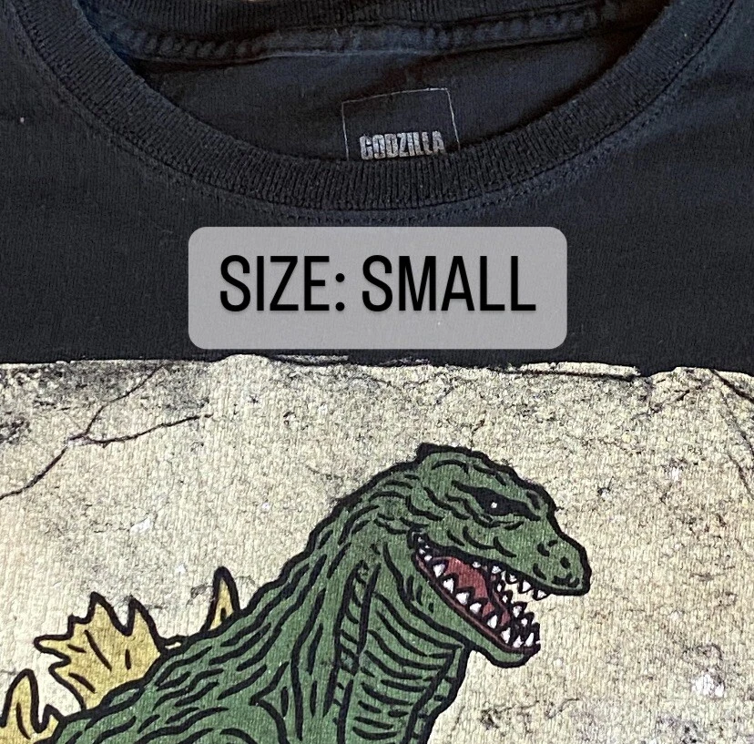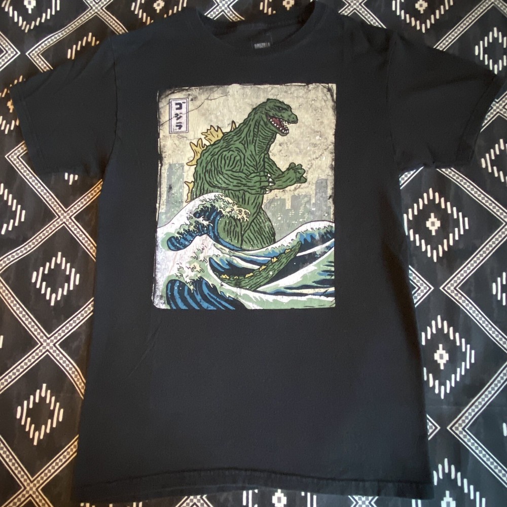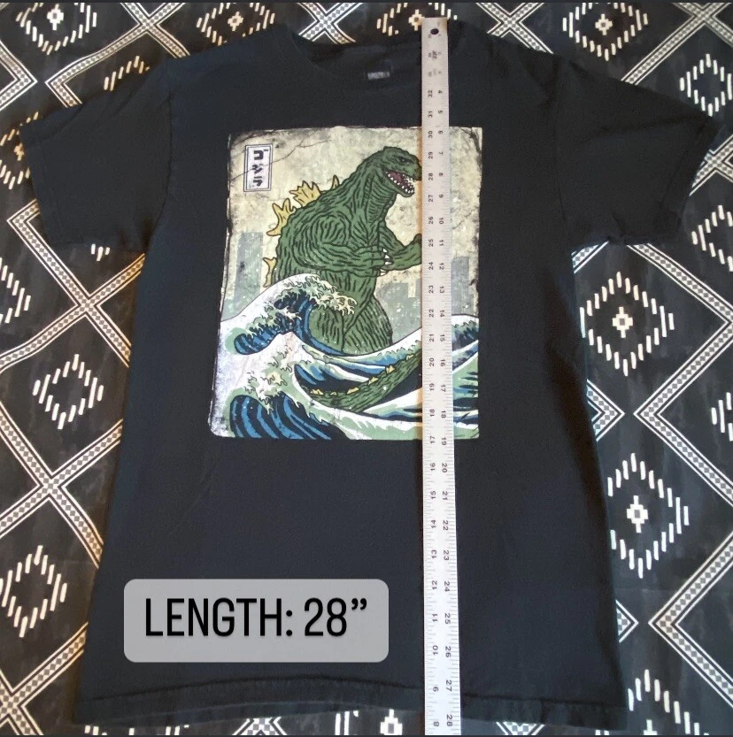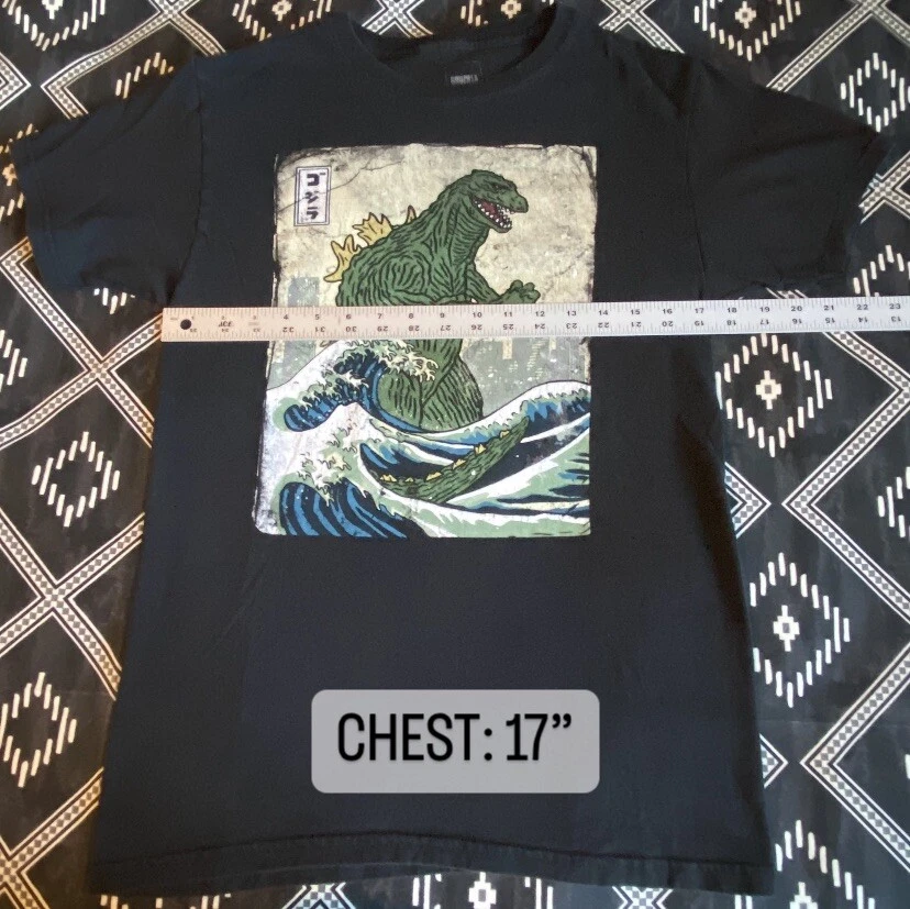 (NV) GODZILLA “Great Wave Off Kanagawa” Mashup Officially Licensed T-Shirt By Toho Co. Ltd. Size: SMALL (ATHLETIC FIT) SIZE TAG INFO HAS FADED: Check Measurements Below. This Creature Feature Mashup tee features the “The King of the Monsters” Godzilla and the iconic Japanese painting “Great Wave Off Kanagawa”. 100% Soft Cotton, Athletic Fit, Black T-Shirt. Condition is "Pre-owned" and is in excellent shape. Shipped with USPS First Class. No Returns. MEASUREMENTS : Fits like a Mens SMALL (S) SIZE TAG INFO HAS FADED: See Measurement Pics (ATHLETIC FIT) Length: 28” Chest: 17” Sleeve: 7” CHECK OUT MY OTHER COOL TEES. NOW AVAILABLE AT MY EBAY STORE! ALL USED CLOTHING HAS BEEN PROPERLY CLEANED & LAUNDERED IN COMPLIANCE TO EBAY POLICY STANDARDS