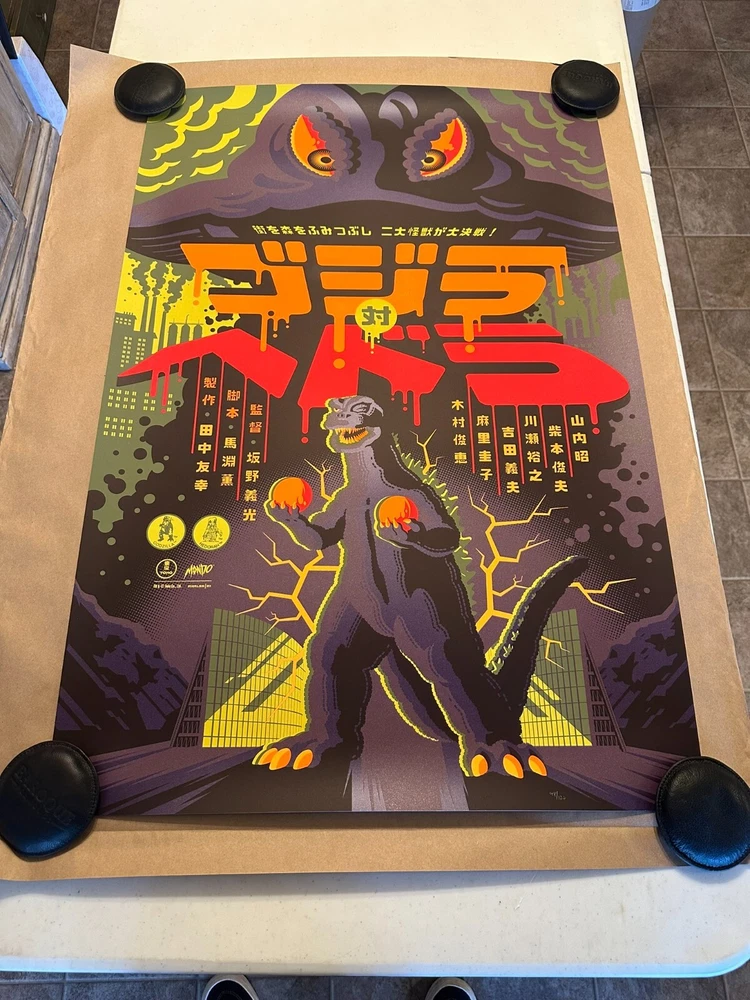 This limited edition Godzilla Vs Heodorah Variant Screen Print/Poster by Tom Whalen is a must-have for any Godzilla fan. Created in 2021 using screen printing techniques, this original piece of art features the iconic Godzilla battling the villainous Heodorah. The poster is numbered out of 120, making it a rare and highly sought-after item for collectors.The poster is perfect for framing and displaying in your home or office. The vibrant colors and intricate details make it a true piece of art. This Godzilla Vs Heodorah Variant Screen Print/Poster is an original. Ships quick in a quality poster tube.