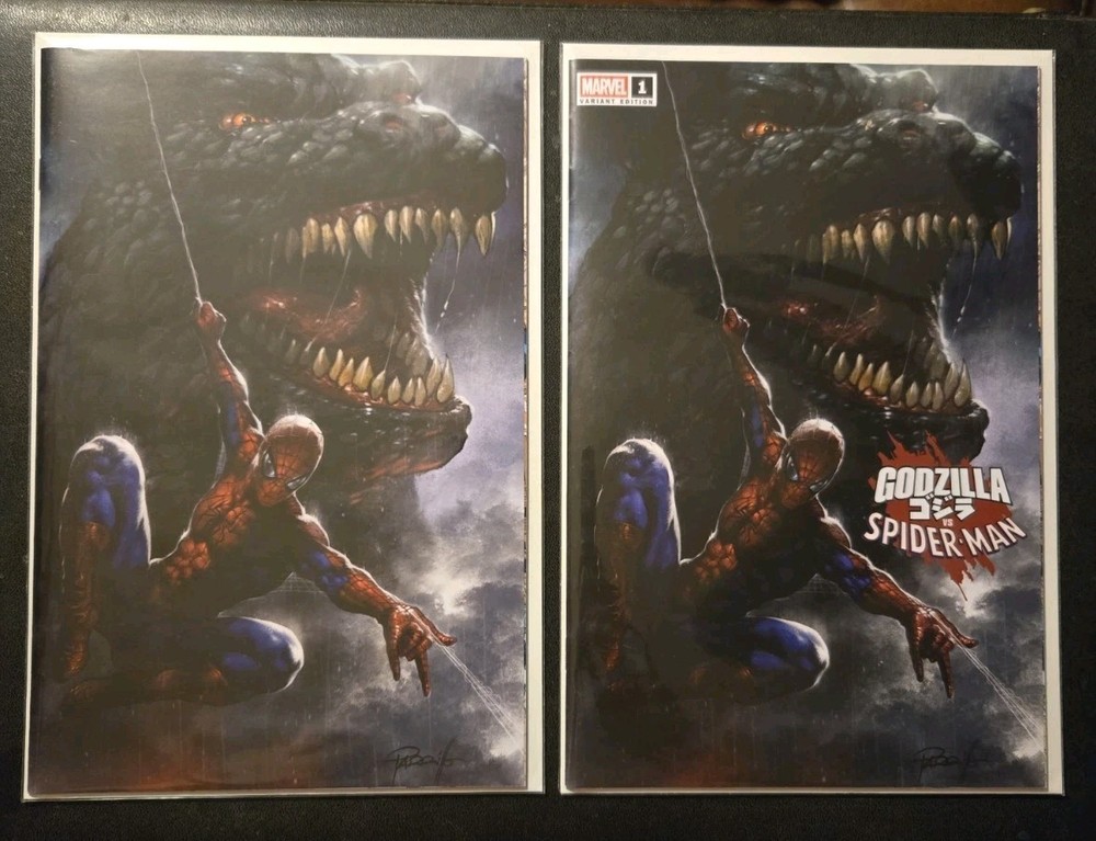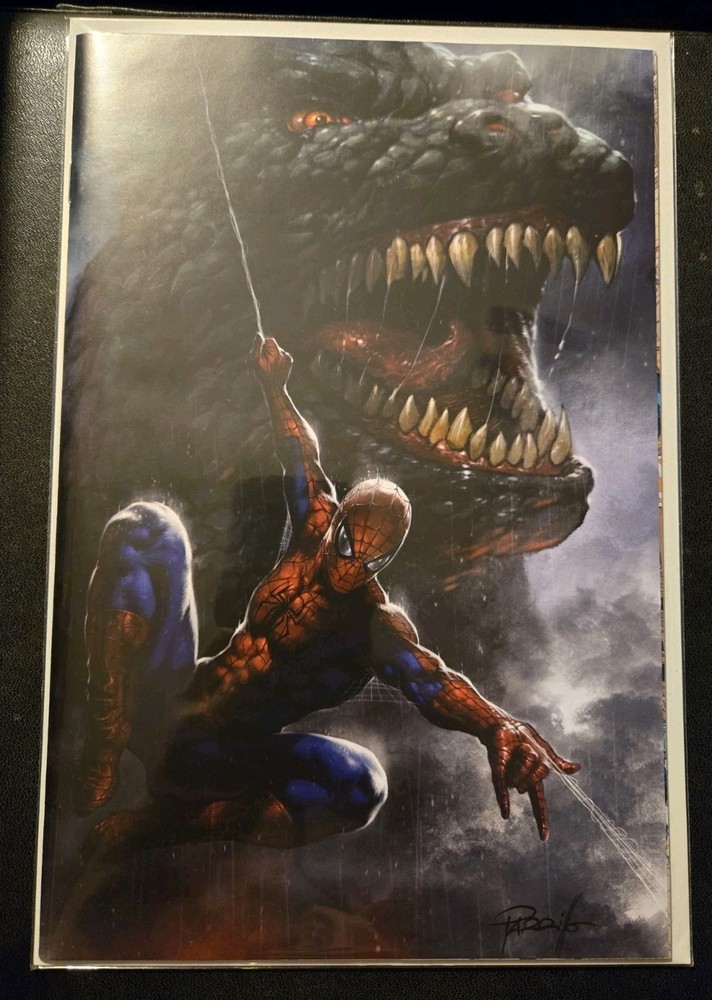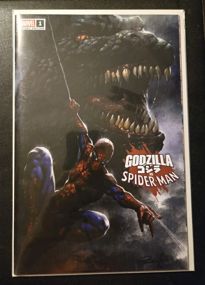 The product is a highly collectible comic book titled "GODZILLA VS SPIDER-MAN #1" by Marvel Comics, featuring artwork by Lucio Parrillo. This special edition variant cover, part of the Spider-Man series, showcases the characters Godzilla and Spider-Man in a full art design. The comic is a US Comics tradition with a modern age style, perfect for general audiences who enjoy action, adventure, and war genres. It is a single issue in English. un graded but never opened or read and Box and boarded