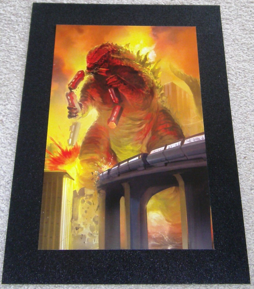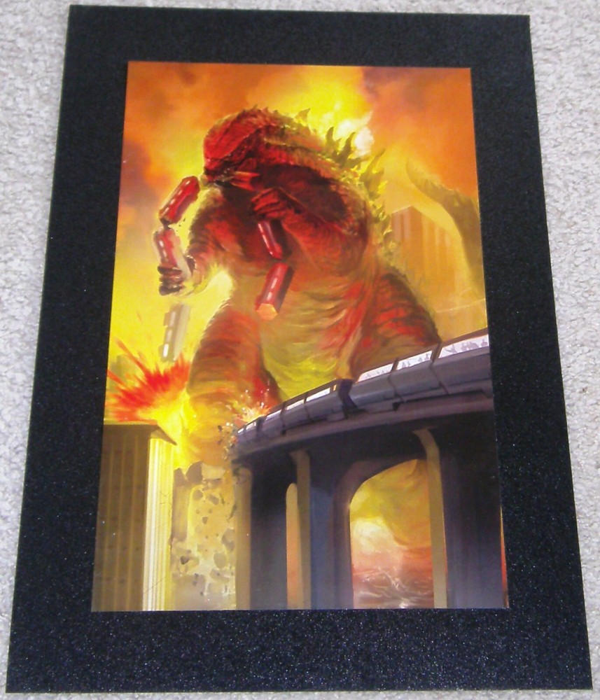 In all honesty, we have NO idea what this stunning artwork of GODZILLA is from (if someone out there in eBay-land knows, we would appreciate hearing from you.). We picked this up at an estate sale and the seller had no clue. It could be from a proposed magazine or comic cover, a movie "workup" for a film or simply a poster. All we know are these details: It is affixed professionally to a black, plastic, mat-finished backboard and measures 20.5 inches by 14.74 inches. The art print itself is a heavier stock and it measures 16.5 inches by 10.75 inches. The print shows Godzilla destroying a train in very bright detail. There are NO wrinkles, tears, bends or marks of any kind on the piece. A chance to pick up a great Godzilla piece. We ship all items in the U.S. and we do ship and sell WORLDWIDE. Please check out our other auctions for many more autographs, promo posters, collectibles, Disney, videos, books and entertainment and sports related items. Check out my other items !