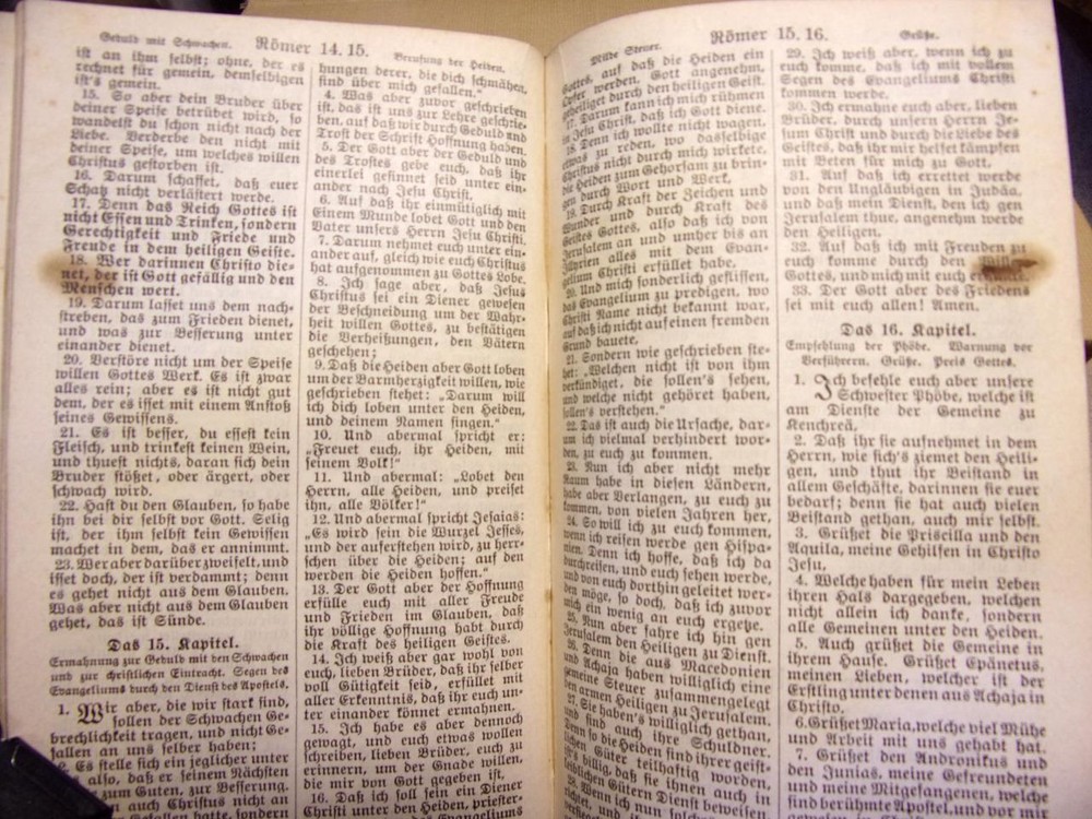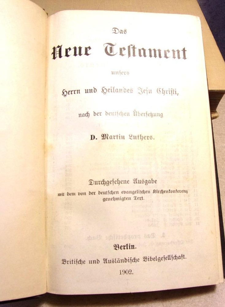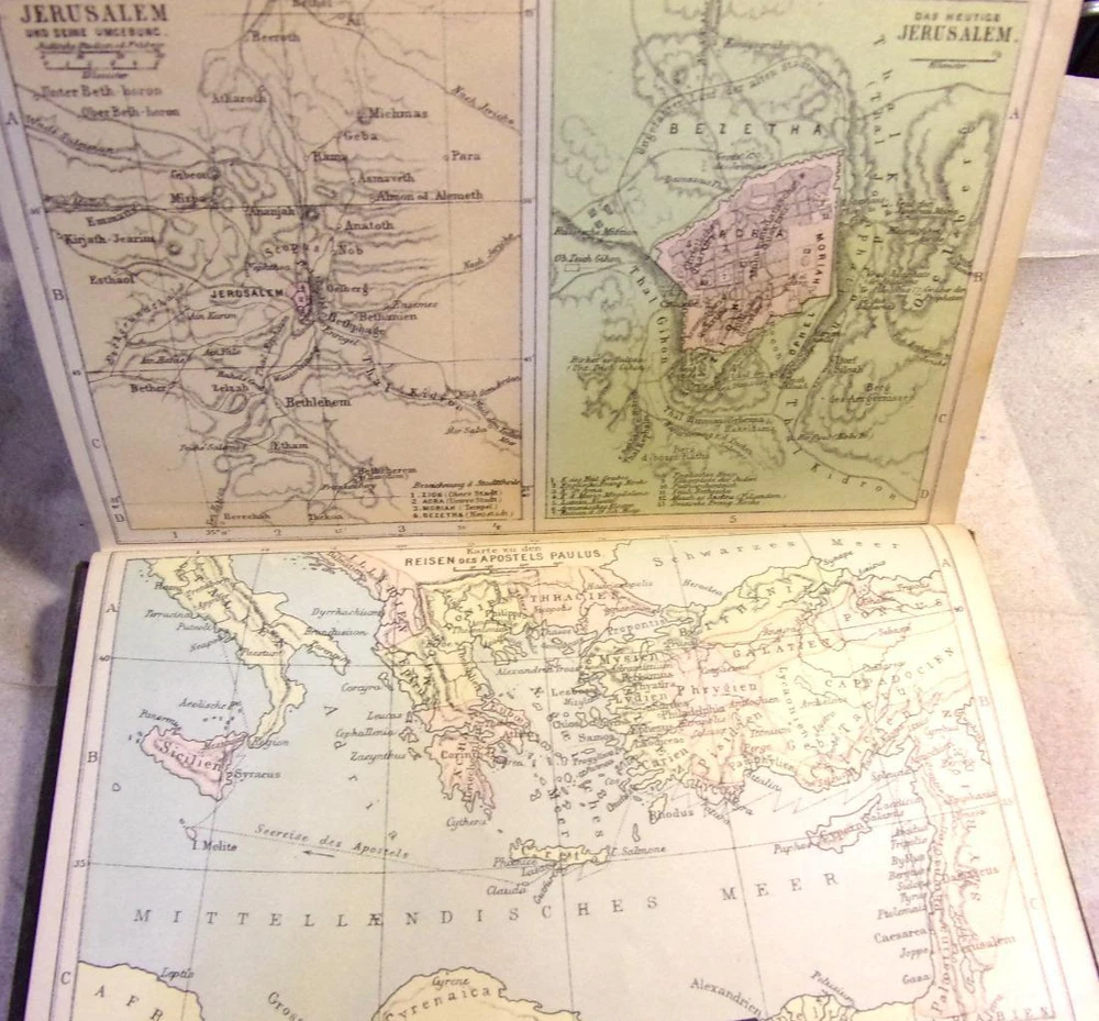 German Das Neue Testament 1902 Berlin w/colored Maps, Leather H/C Herrn und Heilandes - Jesu Christi - D. Martin Luthers - Published: BERLIN 1902 Size ( Approx ) : 6 x 4 in - 83 printed pages - 3 pages colored maps of Holy Land CONDITION : Vintage used condition, some user wear, very good condition for its age. Book contains wear expected of age/use and appears complete, natural page toning, excellent binding, no writing, tears, or missing pages. Two pages have one spot that fades to the next 3 or 4 pages (see photos), Please ask questions prior to bidding. Thank you very much for looking at my item. German Das Neue Testament 1902 Berlin w/Colored Maps, Leather H/C German Das Neue Testament 1902 Berlin w/Colored Maps, Leather H/C Click images to enlarge Description German Das Neue Testament 1902 Berlin w/colored Maps, Leather H/C Herrn und Heilandes - Jesu Christi - D. Martin Luthers - Published: BERLIN 1902 Size ( Approx ) : 6 x 4 in - 83 printed pages - 3 pages colored maps of Holy Land CONDITION : Vintage used condition, some user wear, very good condition for its age. Book contains wear expected of age/use and appears complete, natural page toning, excellent binding, no writing, tears, or missing pages. Two pages have one spot that fades to the next 3 or 4 pages (see photos), Please ask questions prior to bidding. Thank you very much for looking at my item. Payment Payment Through eBay, PAYPAL, ONLY - PAYMENT IS EXPECTED WITHIN 3 DAYS OF AUCTION END. Unless other arrangements have been agreed upon between buyer and seller, after 3 days a non-payment will be filed with eBay to recoup fees. Handling time is within 1-3 days after notification of cleared payment. Please remember that Sellers are not responsible for shipping transit times which vary, particularly during peak periods. Shipping I ship via USPS with delivery confirmation. Shipping is quoted for lower contiguous 48 US States only, and I only ship to those states. Terms of Sale Please abide by eBay Rules and Policies for Terms of Sale. About Us PLEASE NOTE - We obey eBay policies and rules and would appreciate buyers follow the same eBay policies and rules. Thank you very much Contact Us RETURN POLICY: Item must be returned within 14 days after receipt by buyer. Returns are accepted, only, if item was not as described. Buyer to contact seller through eBay messaging before returning item in original packaging as received, with proof of delivery confirmation. Item must be received by seller in same condition as shipped. Refund will be processed under eBay policies minus shipping costs, Photos to be provided to seller before returning an item. My packages are well packed to prevent damage from handling and shipping. Damaged shipments received must be processed per eBay policies. Pictures sell! Auctiva offers Free Image Hosting and Editing. 300+ Listing Templates! Auctiva gets you noticed! The complete eBay Selling Solution. Track Page Views With Auctiva's Counter
