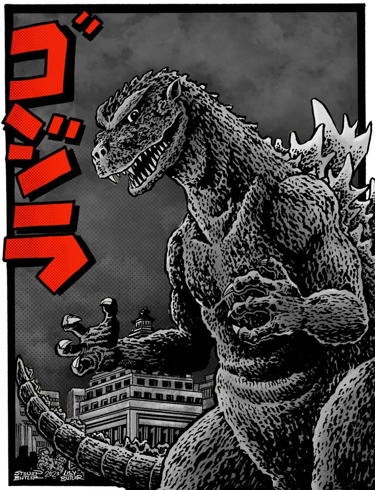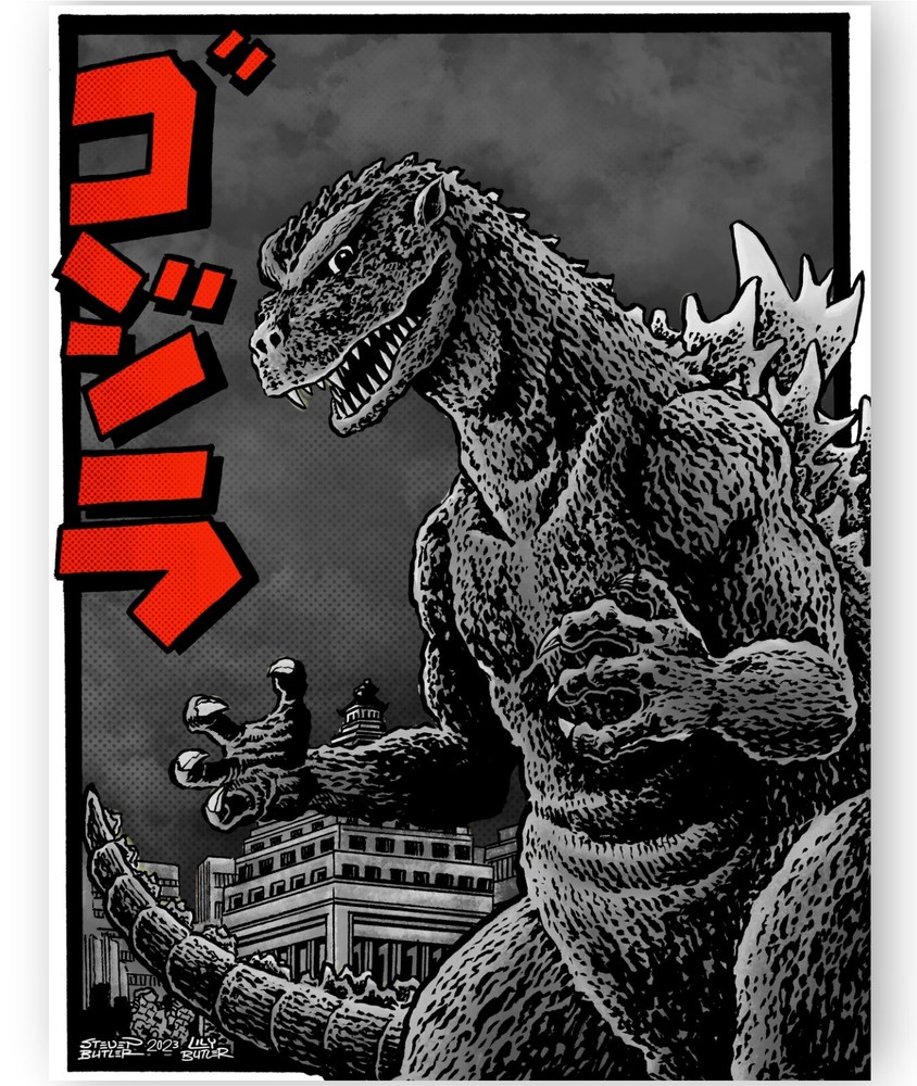 8.5" x 11" art print on 110 lb paper of Godzilla in his original form as portrayed in the 1956 film Godzilla, King of the Monsters . Piece drawn on paper and inked digitally by artist Steven Butler. Colored digitally by artist Lily Butler. Piece is in black-and-white with the kanji text in red.