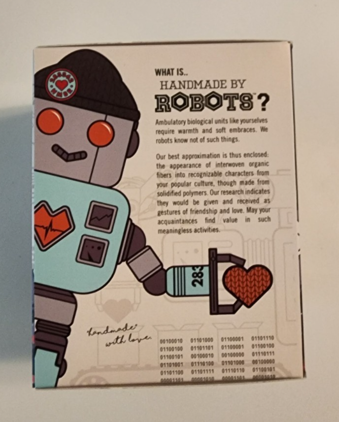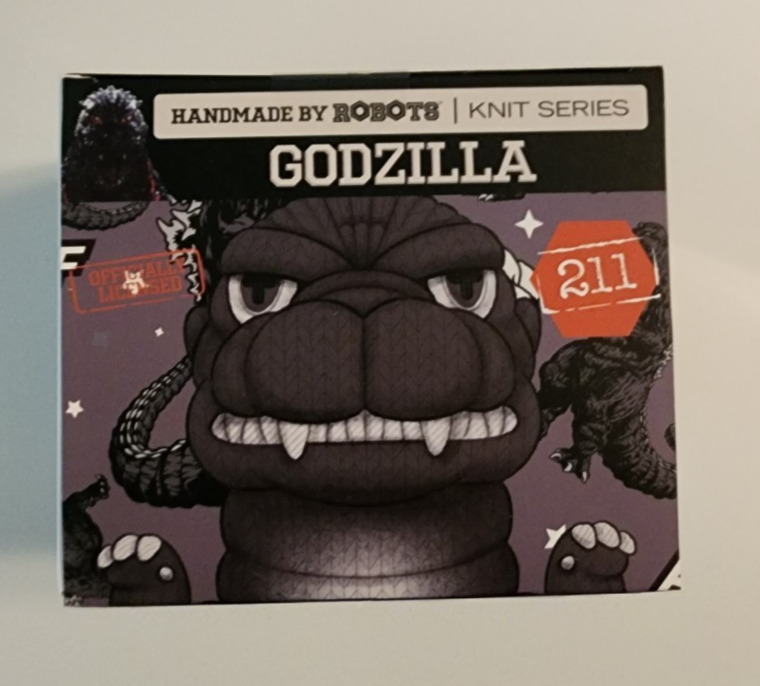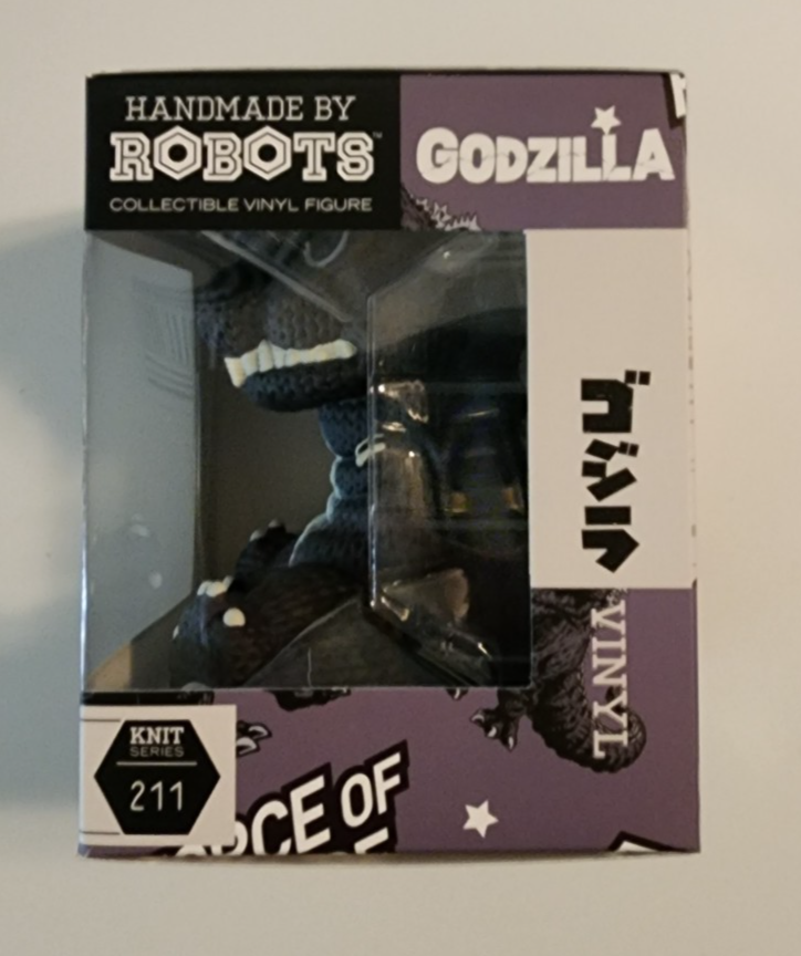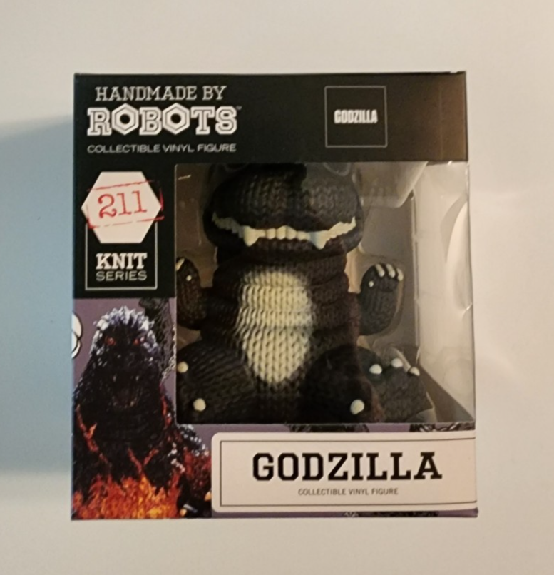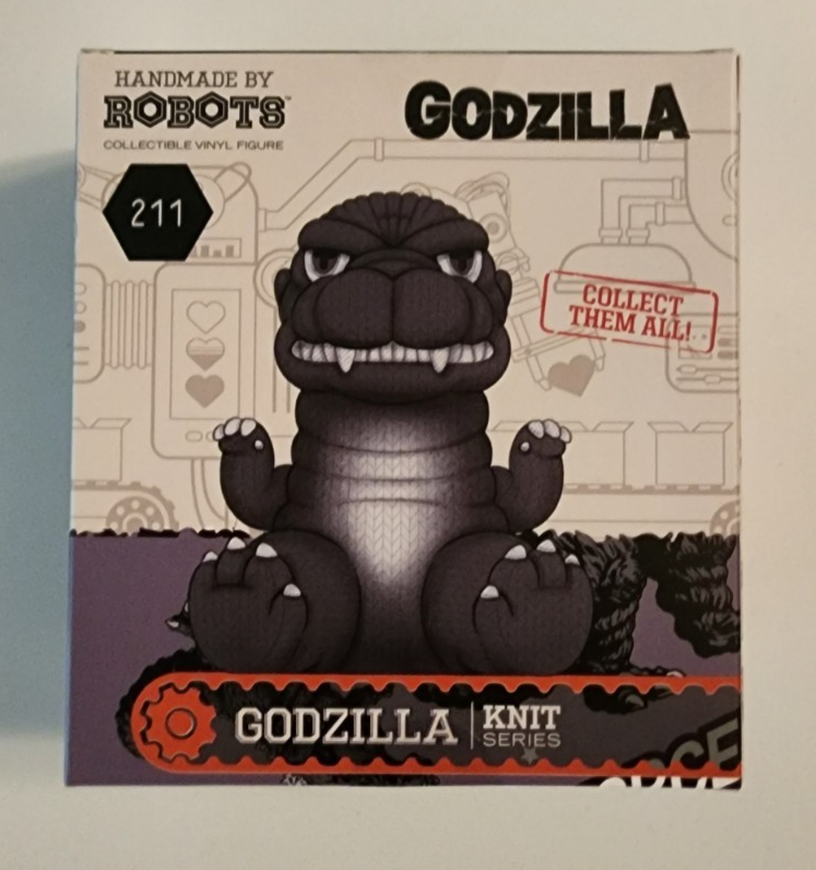 The Godzilla #211 Handmade By Robots Vinyl Figure measures approximately 5-inches tall and is perfect for display or play. Friendly robots designed this figure to look like knit fabric at a glance, but it's actually made of vinyl! Includes vinyl tag on the figure, complete with barcode decal to replicate a sewn-in label. Comes packaged in a window box. For ages 3 and up. What is Handmade by Robots? Ambulatory biological units like yourselves require warmth and soft embraces. We robots know not of such things. Our best approximation is thus enclosed: the appearance of interwoven organic fibers into recognizable characters from your pop culture, though made of solidified polymers. Our research indicates they would be given and received as gestures of friendship and love. May your acquaintances find value in such meaningless activities.