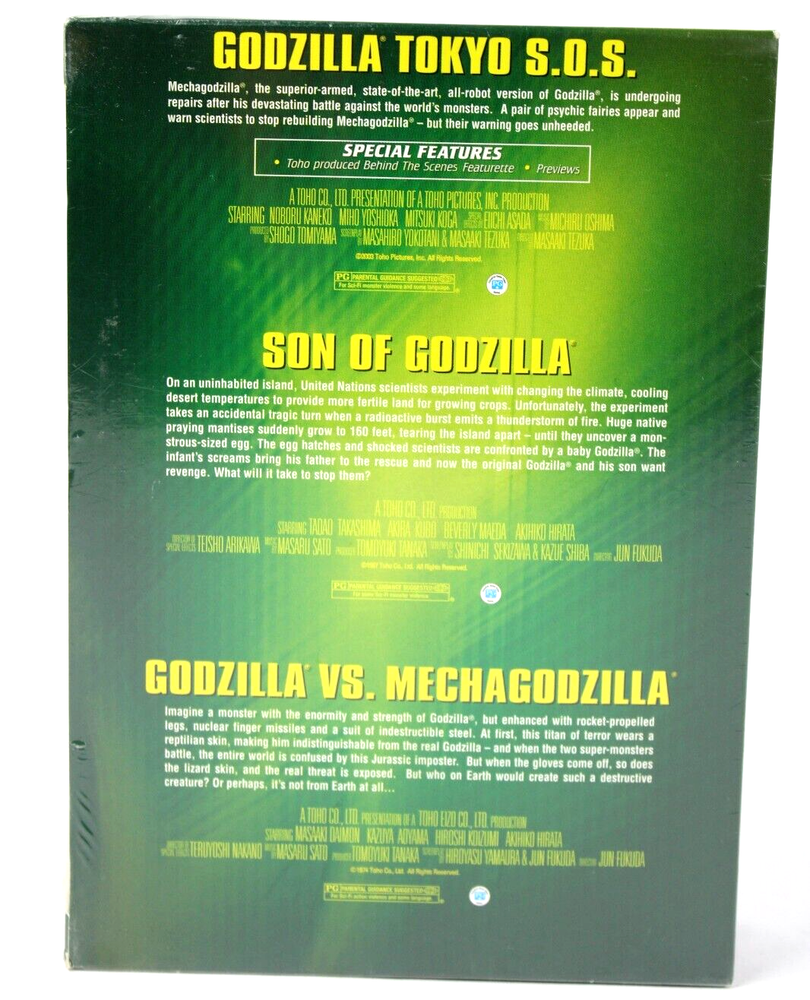 Godzilla 50th Anniversary Collection (DVD, 2000 3-Disc) Box Set Toyko SOS New Brand new factory sealed. ---------------------------------------------------------------------------------------------------------------------------------------------------------------------------------------------------------------- Buy as a great gift or add to your collection. Fast Shipping within the USA (Alaska and Hawaii excluded at seller discretion). We offer international shipping via eBay's Global Shipping Program. Please inquire with Ebay about cost and availability. WE DO NOT DISCOUNT OR REFUND THE DIFFERENCE IN COSTS OF SHIPPING. By purchasing the item, the BUYER AGREES to pay all costs in full. Costs will NOT be adjusted or refunded or reimbursed after payment is received. Payments: We only accept Paypal. Shipping: We ship your item within one business day of your payment clearing (except on weekends and holidays.) WE DO NOT DISCOUNT OR REFUND THE DIFFERENCE IN COSTS OF SHIPPING. By purchasing the item, the BUYER AGREES to pay ALL costs in full. Costs will NOT be adjusted or refunded or reimbursed after payment is received for any reason. Returns: We accept any item back within 30 days of original purchase date. All returns MUST come back in the same condition they arrived in. Returns will be issued at the discretion of seller, on a case by case basis, provided that the buyer proves beyond a reasonable doubt their reason for return, via pictures or video. Returns will only be issued after confirmation that the original item has been returned to seller. Feedback: We aim to earn 5 STAR 100% feedback for our service and products provided. If you are happy with your purchase, please take a minute to leave us 5 STAR positive feedback. If you have any issue with your item, please contact us directly via Ebays message service so we can resolve the problem and earn positive 5 STAR feedback.
