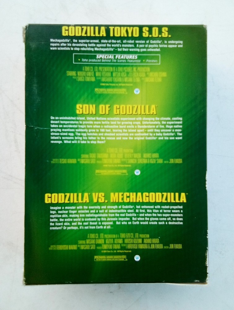 Celebrate the 50th anniversary of Godzilla with this 3-disc DVD set featuring Tokyo SOS, Godzilla Vs. Mechagodzilla, and Son of Godzilla. Directed by Jun Fukuda and Masaaki Tezuka, this collection includes sci-fi and fantasy films that are perfect for fans of the genre. The DVD set comes in a tall/DVD case and features an aspect ratio of 16:9 in NTSC video format. The Godzilla Box Set is a must-have for collectors and fans alike. Produced by Charles Roven, the set includes English subtitles and Japanese language options. This DVD set is region code 1 (US, Canada...) and is rated G. The collection is a great addition to any movie or Godzilla fan's collection.