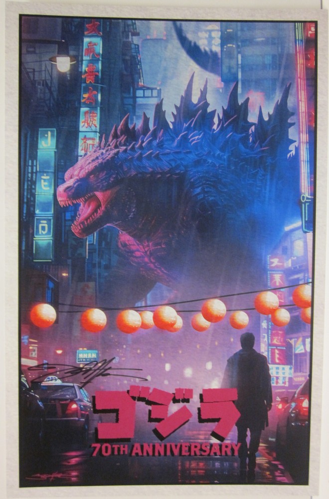 Godzilla 70th Aniv. by Jed Thomas. This print measures 11" x 17". Shipping for multiple items will be calculated. Shipping in the U.S. is calculated with USPS and we always combine shipping. Shipping out of the U.S. is calculated, with first class or priority mail. This print comes shrink wrapped to fome cor in the U.S. for safe shipping and ease of handling for buyer.This print is in no way affixed to fome cor, only wrapped and then shrunk.