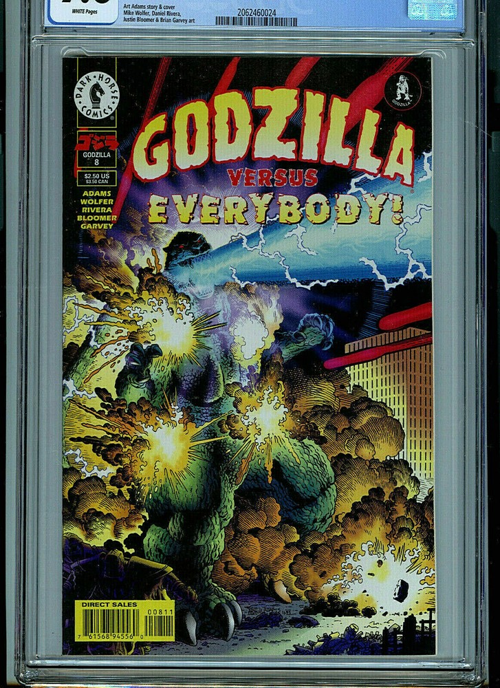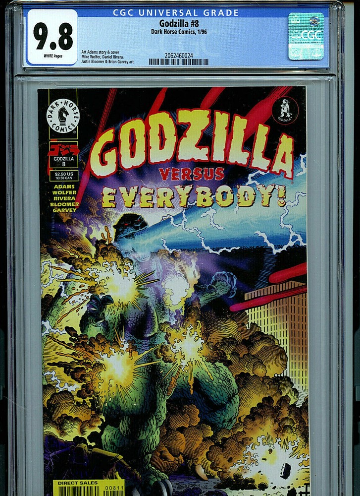 You are buying a copy of Dark Horse Comics Godzilla Issue #8 comic certified and graded by CGC as being in 9.8 NM/MT condition. Published and released in 1996. Godzilla fans, you know who you are, this is a must have for your collection. Written by ART ADAMS. Art by MIKE WOLFER, DANIEL RIVERA, JUSTIN BLOOMER & BRIAN GARVEY. How much punishment can the King of the Monsters take, anyway? Godzilla has already survived several attacks by a race of fierce, alien hunters. Now he needs a little help from his friends from G-Force, or else it's certain extinction at the hands of the fiercest hunters in the galaxy! Cover price $2.50. PAYMENT & SHIPPING TERMS Payment is expected 1-3 days after the close of the transaction, we may elect to cancel the transaction and re-list this item if payment is not made within that time frame US BUYERS pay $16.99 for shipping within the 48 states. California residents please add 8.75 % for sales tax. International shipping for this item is higher than for shipping within the US. International buyers please make sure to inquire about shipping & payment options to your address before making your purchase. . INTERNATIONAL BUYERS . Shipping to international addresses cost more than shipping within the US. Please make sure to inquire about shipping costs before you make any purchase. We use insured priority airmail as our default shipping method. .PAYMENT OPTIONS & TERMS: We accept PAYPAL: Please check our other items at our Ebay Store at: American Icons Collectibles We have many great items at our eBay store and we have hidden some real bargains for your viewing and shopping enjoyment. You can buy this item or many other great items now from our eBay store at: American Icons Collectibles Check out our other eBay auctions! Add Me to Your Favorite Sellers American Icons Collectibles selling Collectibles Since 1989 OUR BUSINESS HOURS ARE M-F 11-7 PST Closed Weekends & Holidays Search For Items At American Icons Collectibles Search titles and descriptions