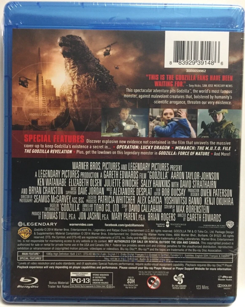 WANT IT A LOT CHEAPER?? HUGE SAVINGS!! If you are interested in Purchasing more than one of my over 5,000 Movies & CDs, SIMPLE!! Just Send Me a Message with the Items you Select and I will Make you a Wonderful Bundle Deal that you will probably not Pass Up, The More Items you Select the Bigger Deal you will Receive !! Godzilla [2014] (Blu-ray,2014) Elizabeth Olsen, Aaron Taylor-Johnson, Ken Watanabe, Bryan Cranston, Sally Hawkins, Juliette Binoche, David Strathairn, Ty Olsson Brand New Factory Sealed!! Look at Photos!! All My Items are 100% Guaranteed to Play Perfectly or your Money Back!! PLEASE VIEW PICTURES!! THEY SPEAK A THOUSAND WORDS!! ASK QUESTIONS BEFORE PURCHASING!! Optional USPS Ground Advantage Postal Upgrade only $3.99!! (The USPS did away with First Class Package Service, This is what Replaced it) NOTE: The USPS has been having delays nationwide and have impacted delivery times on some orders 90% of all orders have no delays and arrive before the estimated delivery date The FREE SHIPPING expected delivery with tracking is normally 3-8 business days but IF delayed by USPS, orders may take much longer I ship all orders no later than the next business day after they are received Unfortunately, once shipped the delivery date is out of my control since I am no longer in possession of item PLEASE CONSIDER POSSIBLE USPS DELAYS BEFORE PURCHASING!!! I wanted to make all prospective buyers aware before ordering, that once I ship your item through USPS that I cannot do anything else to speed your package up! BUY A FEW,SAVE BIG! Promotions!! (Have to click on the promotion at the bottom of the page and has to be shipped to same address) SAVE $8 for every 4 items you Purchase OR SAVE $ 15 for every 7 Items you Purchase Have a Great Day!! Please check the pictures of the actual item for quality If Offered, There is no Guarantee that Digital copy code is not expired, used or even included What is pictured is what you get, Please ask questions if you need more information Don't be fooled by all the other listings with Stock Photos, Know what you are buying!!! Increase your Savings by purchasing More than One Item!!! I regularly have Promotional Offers that include a Substantial Discount for Purchasing more than one of my already heavily discounted Items. You will see these Promotional Offers at the top of most every one of my listings. All you have to do is click on the Promotional Offer and pick the additional Items you would like to capitalize on the great discounts described in the offer Save Money on Shipping!! If you're like me and you want your item shipped quicker than Media Mail, I have heavily discounted the quicker Shipping Methods for you on most Items!! So go ahead and get your Item SUPERFAST and save a load of CA$H as well!!!!