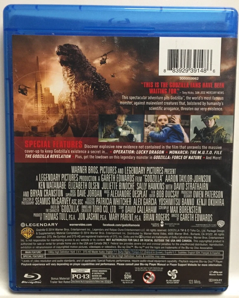 WANT IT A LOT CHEAPER?? HUGE SAVINGS!! If you are interested in Purchasing more than one of my over 5,000 Movies & CDs, SIMPLE!! Just Send Me a Message with the Items you Select and I will Make you a Wonderful Bundle Deal that you will probably not Pass Up, The More Items you Select the Bigger Deal you will Receive !! Godzilla [2014] (Blu-ray/DVD,2014,2-Disc Set) Elizabeth Olsen, Aaron Taylor-Johnson, Ken Watanabe, Bryan Cranston, Sally Hawkins, Juliette Binoche, David Strathairn, Ty Olsson Very Good Blu-ray, DVD Not a Scratch!! Case Lightly Worn, Look at Photos!! All My Items are 100% Guaranteed to Play Perfectly or your Money Back!! PLEASE VIEW PICTURES!! THEY SPEAK A THOUSAND WORDS!! ASK QUESTIONS BEFORE PURCHASING!! Optional USPS Ground Advantage Postal Upgrade only $3.99!! (The USPS did away with First Class Package Service, This is what Replaced it) NOTE: The USPS has been having delays nationwide and have impacted delivery times on some orders 90% of all orders have no delays and arrive before the estimated delivery date The FREE SHIPPING expected delivery with tracking is normally 3-8 business days but IF delayed by USPS, orders may take much longer I ship all orders no later than the next business day after they are received Unfortunately, once shipped the delivery date is out of my control since I am no longer in possession of item PLEASE CONSIDER POSSIBLE USPS DELAYS BEFORE PURCHASING!!! I wanted to make all prospective buyers aware before ordering, that once I ship your item through USPS that I cannot do anything else to speed your package up! BUY A FEW,SAVE BIG! Promotions!! (Have to click on the promotion at the bottom of the page and has to be shipped to same address) SAVE $8 for every 4 items you Purchase OR SAVE $ 15 for every 7 Items you Purchase Have a Great Day!! Please check the pictures of the actual item for quality If Offered, There is no Guarantee that Digital copy code is not expired, used or even included What is pictured is what you get, Please ask questions if you need more information Don't be fooled by all the other listings with Stock Photos, Know what you are buying!! Increase your Savings by purchasing More than One Item!!! I regularly have Promotional Offers that include a Substantial Discount for Purchasing more than one of my already heavily discounted Items. You will see these Promotional Offers at the top of most every one of my listings. All you have to do is click on the Promotional Offer and pick the additional Items you would like to capitalize on the great discounts described in the offer Save Money on Shipping!! If you're like me and you want your item shipped quicker than Media Mail, I have heavily discounted the quicker Shipping Methods for you on most Items!! So go ahead and get your Item SUPERFAST and save a load of CA$H as well!!