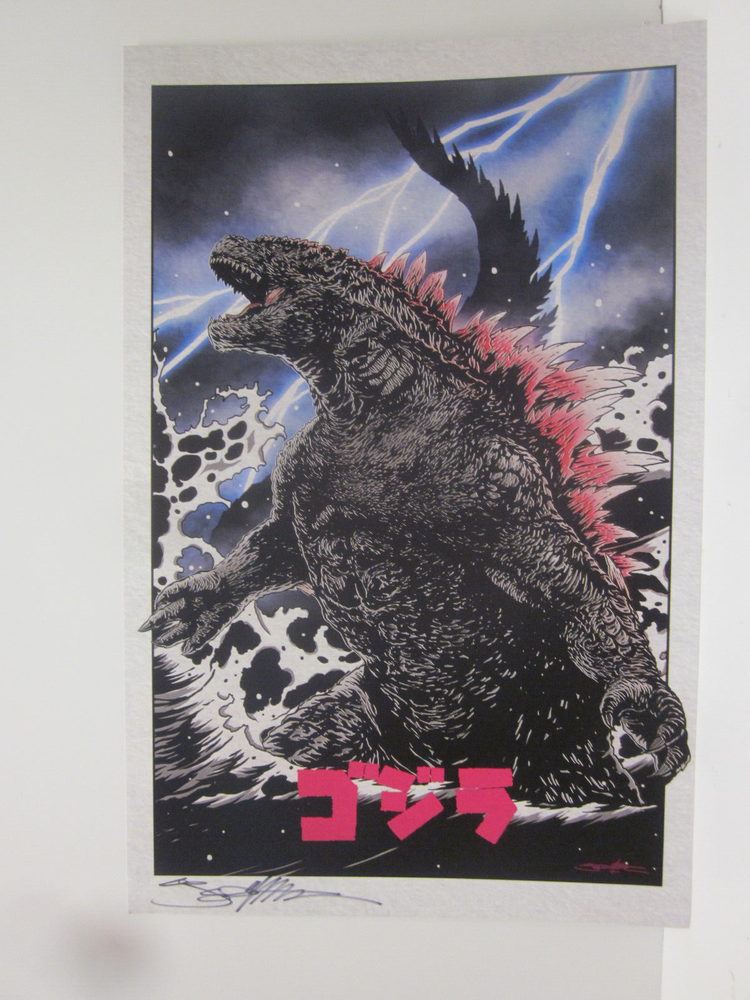 Godzilla By Ned Thomas Hand Signed Shrink Wrapped Print. This print measures 11" x 17". Shipping for multiple items will be calculated. Shipping in the U.S. is calculated with USPS and we always combine shipping. Shipping out of the U.S. is calculated, with first class or priority mail. This print comes shrink wrapped to fome cor in the U.S. for safe shipping and ease of handling for buyer.This print is in no way affixed to fome cor, only wrapped and then shrunk.