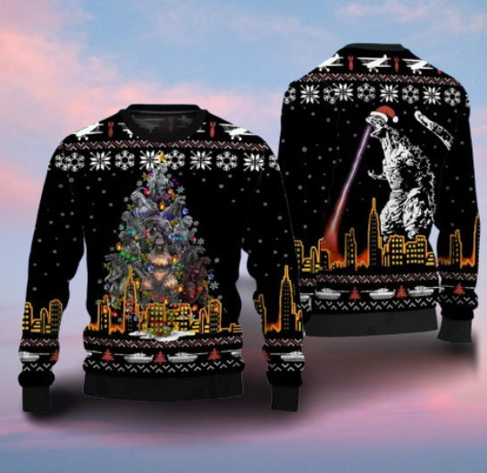 Godzilla Christmas Ugly Sweater with Xmas Tree Design 2024