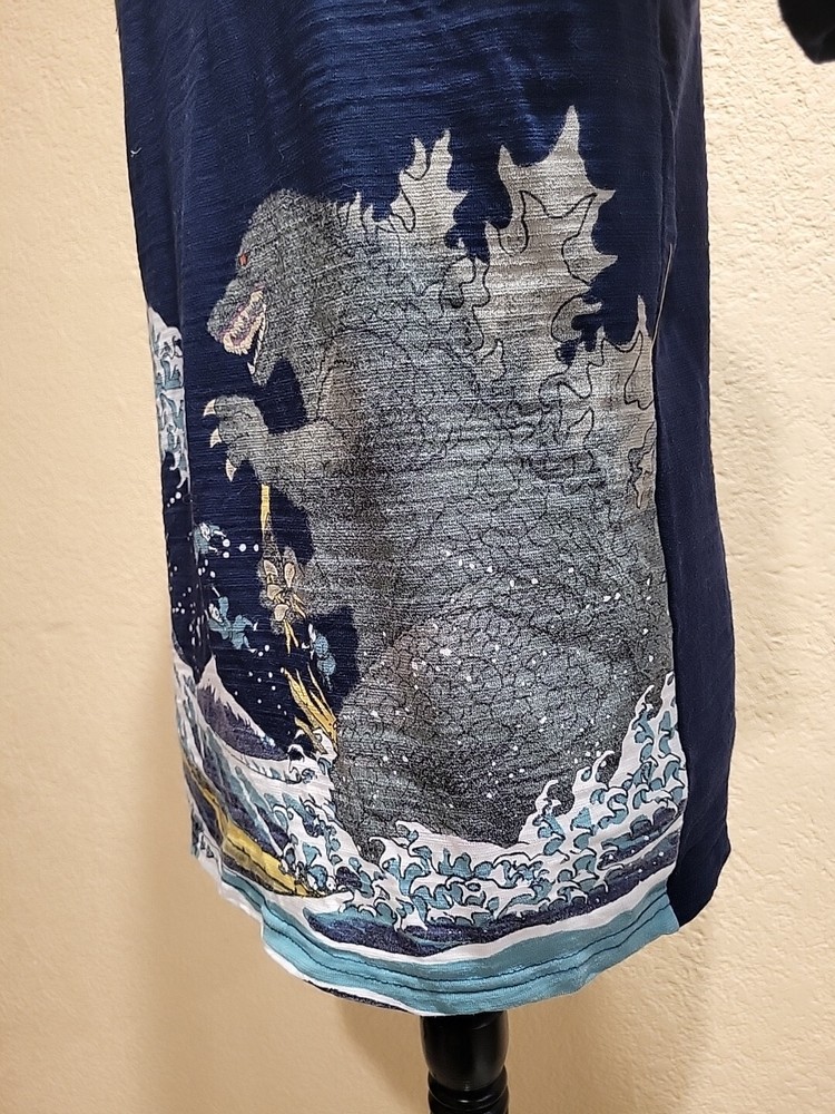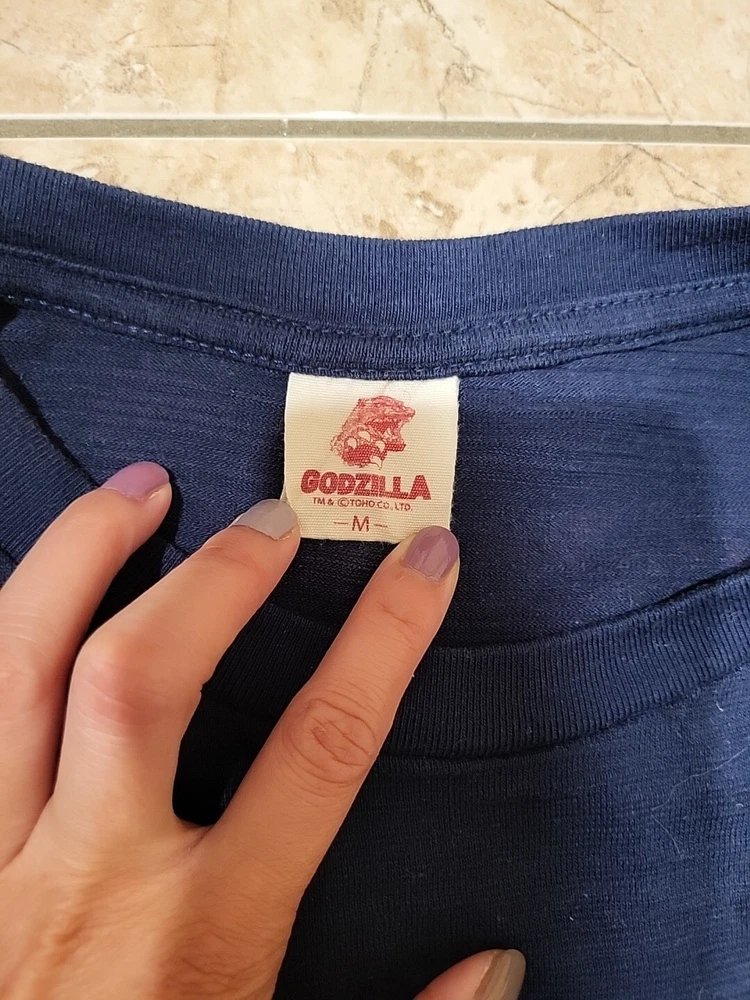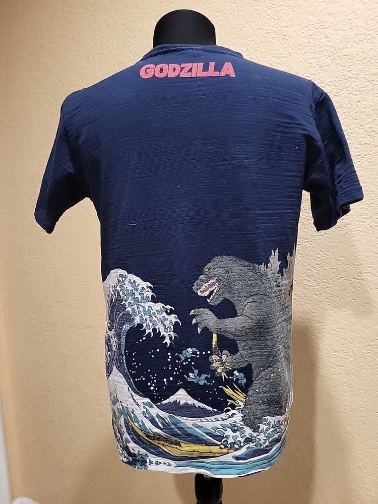 Show off your love for Godzilla with this stylish double-sided art t-shirt. The blue cotton shirt features a crew neckline and short sleeves, with a slim fit that is perfect for both men and women in size M. The t-shirt is designed with vintage graphics that highlight the iconic movie monster, and is perfect for fans of the Godzilla franchise. The shirt is made from high-quality cotton material and features a graphic print that is sure to catch the eye of anyone who sees it. The double-sided design adds an extra touch of uniqueness to the t-shirt, making it a great addition to any wardrobe. Whether you're a fan of the movie or just love the art style, this Godzilla t-shirt is a must-have for any unisex adult.