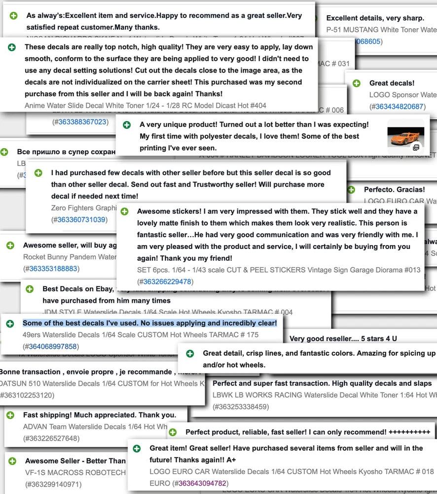 Decals are awesome, they look just like photo online, Great communicator had several questions, Fast shipping even for international, Decals were wrapped in several layers and shipped in a Will be purchasing several other sets I want.. Thanks SAM .... Will submit order this next week... Highly Recommend this seller...